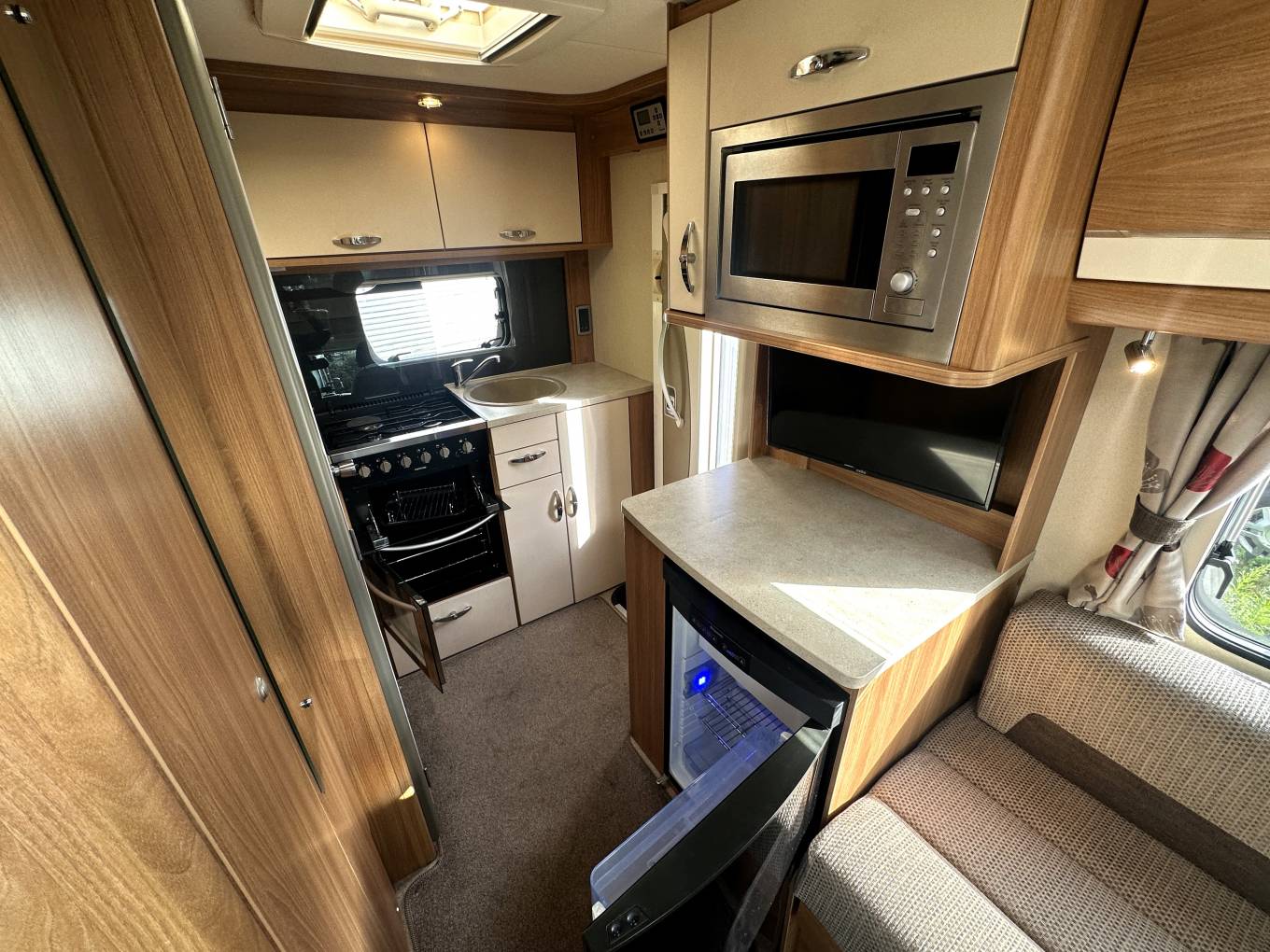 and grill, sink with mixer tap, microwave and 3-way fridge with small freezer