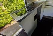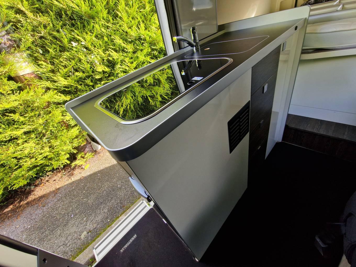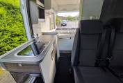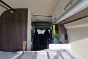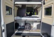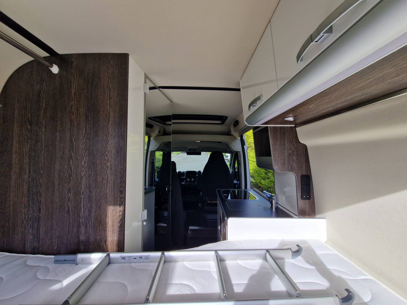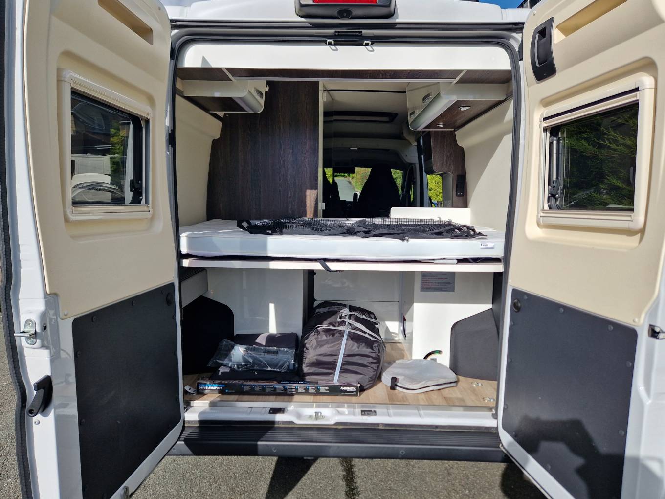 Towards the rear of the camper is the versatile fixed bed with large garage underneath, which can be made bigger by simply lifting one half of the bed up to allow the storage of larger items such as bikes. If you require even more space, both sides of the bed can be lifted up and slid forwards, or this bed can be removed completely, making the garage even larger.