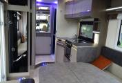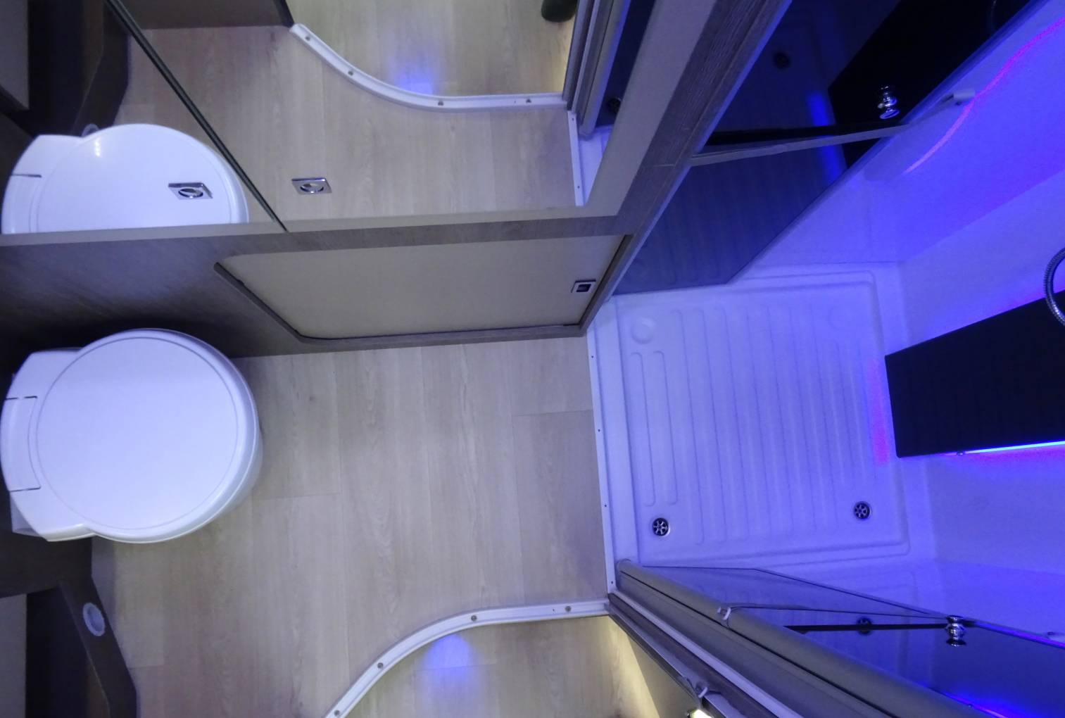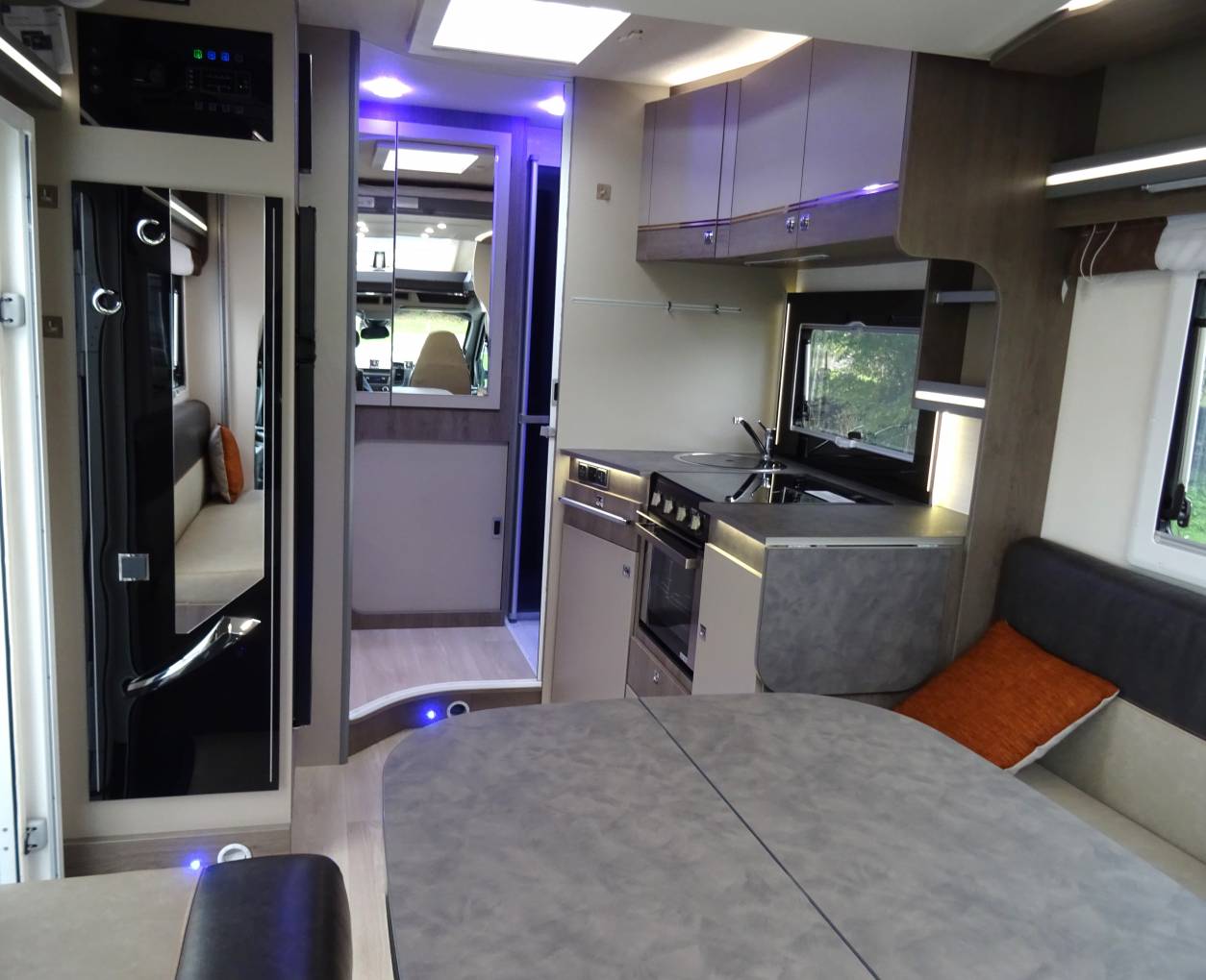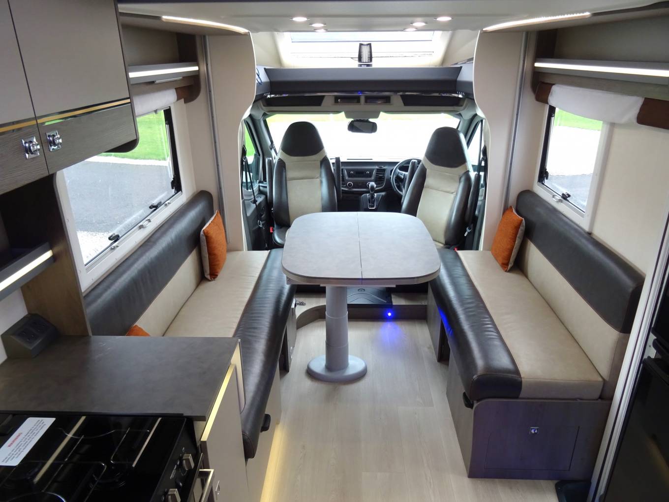 Beautifully appointed luxury motorhome for 2 with additional full travelling seats and double bed for 2 more when required. This is a classy motorhome with subtle colours and lighting and a number of features which make it a stand out from your typical motorhome. On a Ford cab/chassis, the vehicle has an automatic gearbox for the 170 bhp engine. The driver and passenger seats swivel to add to the spacious dining/socialising area with electrically operated and folding dining table, along side the two salon bench seats which conceal two passenger seats with full travelling seatbelts. This area converts to a large comfortable double bed if required. The main sleeping accommodation is in the electrically operated large double bed which is situated above the dining area and stowed during the day to provide full habitation space during non-sleeping time!