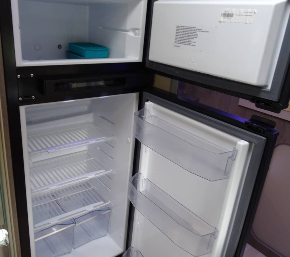 The kitchen area has a very large fridge with integrated freezer that would be at home in any residential kitchen, duel fuel hob with gas hob and electric hotplate , oven/grill and sink with additional preparation area. The washroom is a particular feature of this motorhome with a separate full height shower cubicle which can be separated from the rest of the bathroom which has vanity units, Thetford electric flush w.c. and large mirrors which are the doors to a massive wardrobe with hanging rail. Within the bathroom is a sliding door which gives access to a huge garage at the rear of the vehicle with large external access doors.