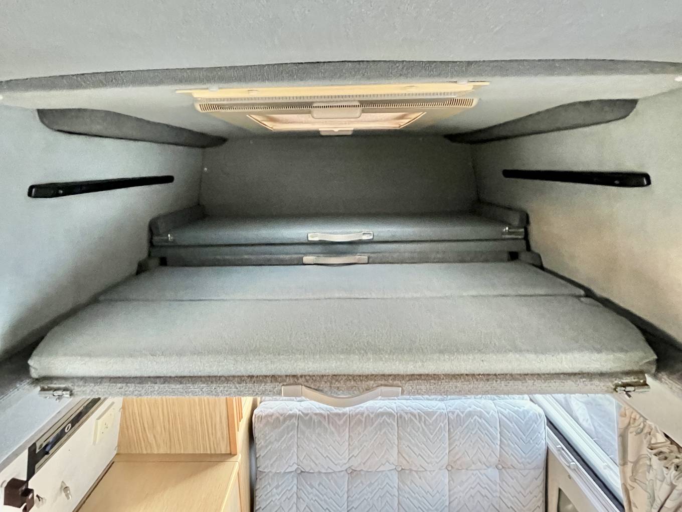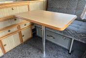 As you enter the van you will notice further storage cupboards above the cab area, one containing the original ceramic dishes and plates, a second with the original mugs and glasses and a final larger central cupboard is empty for further storage. As you look to the rear of the hi Top you will see the make up roof bed and below this the rock and roll main bed with two further seat belts when up in the seating position. Underneath the bed is a storage area containing the table legs and a small occasional table, the larger table is stored behind the drivers seat. to the left of the rear bench seat is access to the hanging wardrobe, the seat fabrics and curtains are in very good condition and complement the vans woodwork extremely well.