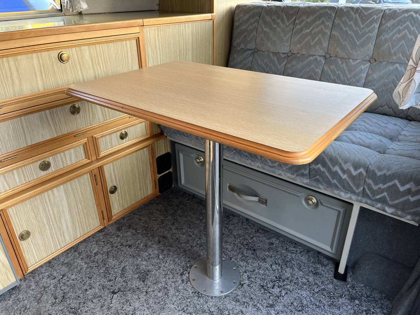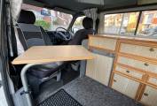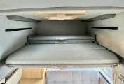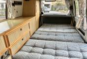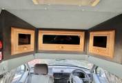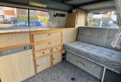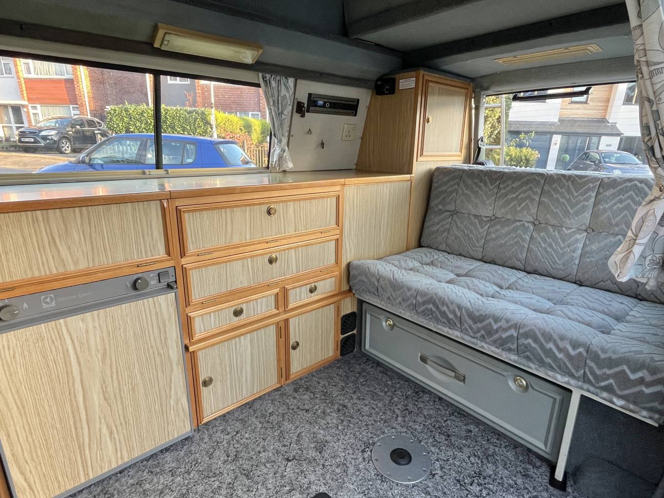Once you open the sliding door the first thing you notice is the large floor space and the headroom in the van, in front of you is the two burner hob and the sink and drainer discretely hidden under the worktop area, below you have a 3 way fridge and plenty of drawer and cupboard storage along with a storage area fro the Elsan porta potti and a further cupboard with access to gas taps and electrical circuit breakers, the final lift up worktop panel contains a deep storage area complete with two wire baskets, above this area is the control panel and propex blown air heating controls.
