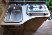 The kitchen area has a 2-burner gas hob, stainless-steel sink with mixer tap and an under-counter fridge with small freezer compartment. The washroom consists of a Thetford cassette toilet, hand basin with mixer tap that doubles as the shower head and a storage locker. Blown-air heating and hot water is provided by a Truma system, there are blinds and flyscreens on the side windows and curtains to the rear. The two roof lights give plenty of light throughout and with storage found in the over-cab area, kitchen, wardrobe and over-head lockers at the rear, there is plenty of space for all your essentials.