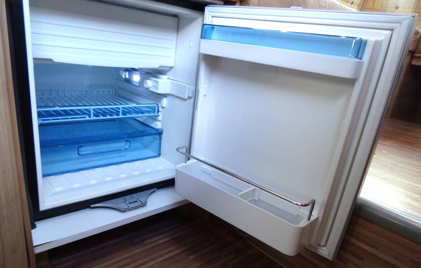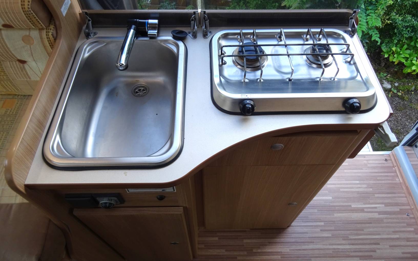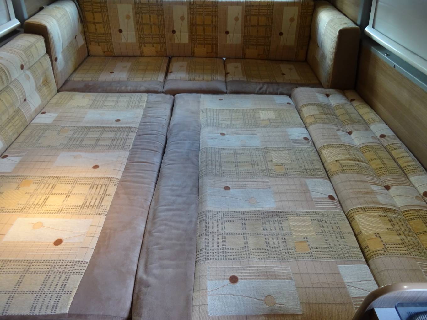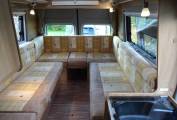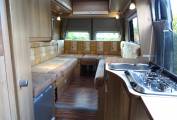 The habitation area is a lovely area for relaxing and dining with comfortable seating in the u-shaped lounge/dining area that comes with the original larger rectangular dining table. The lounge area easily converts into a large double bed at night-time or can be used as two single beds if preferred.