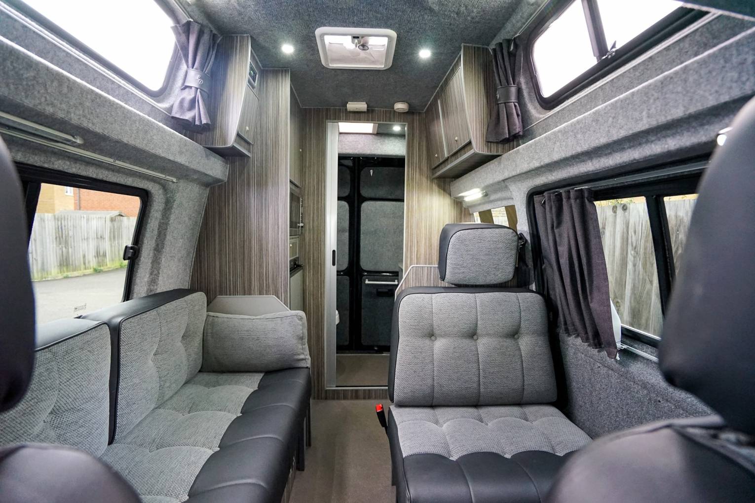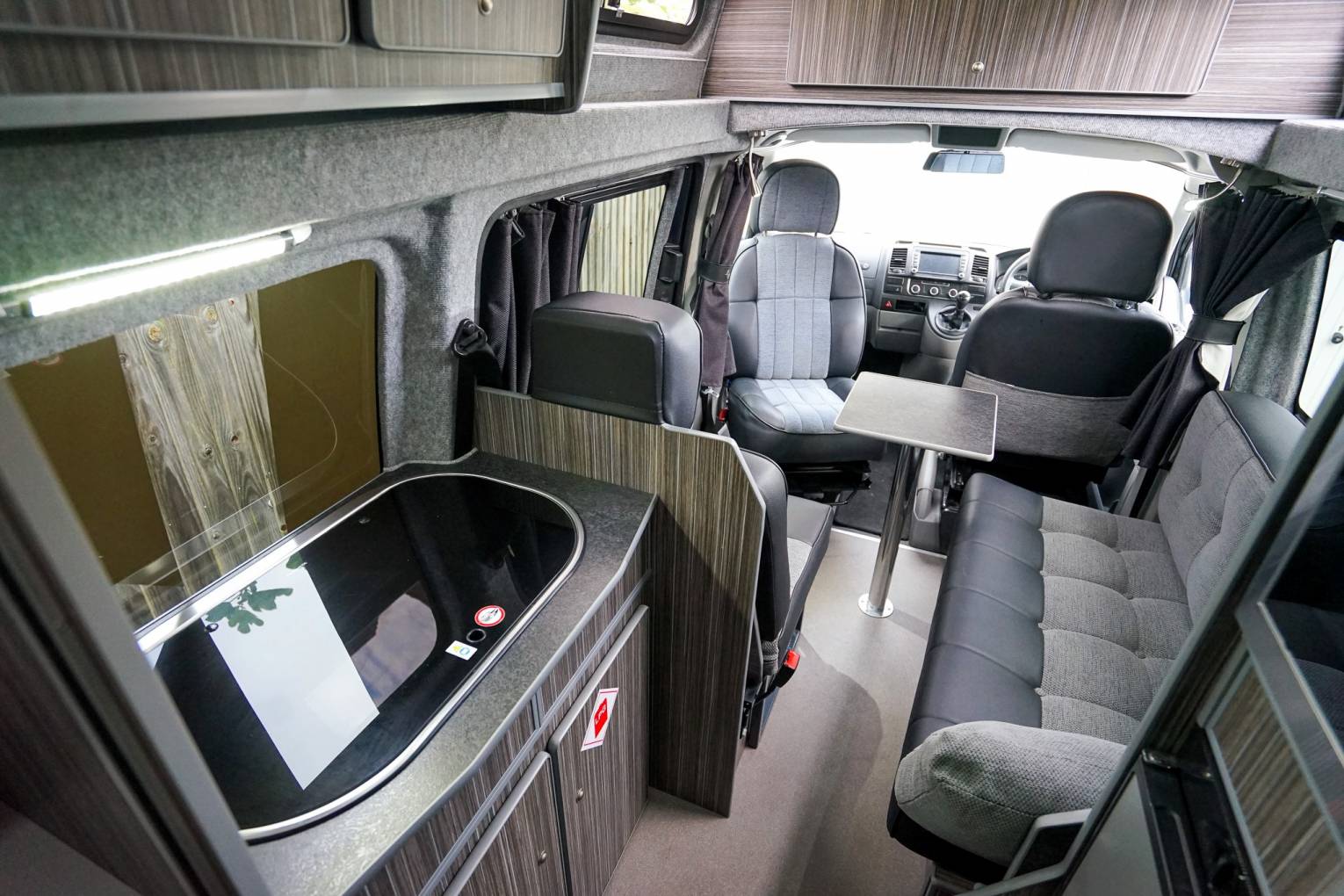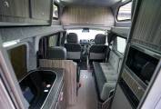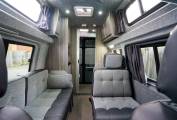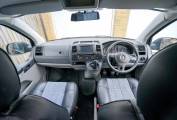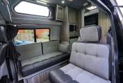 Moving through the vehicle you will find the kitchen area which includes a sink, 2x gas hobs, built-in microwave/oven combi and fridge with small freezer compartment. Past here is one of the most unique and best features of a van this size which is a rear washroom fitted with toilet cassette and wash basin.