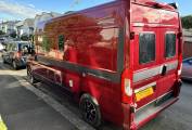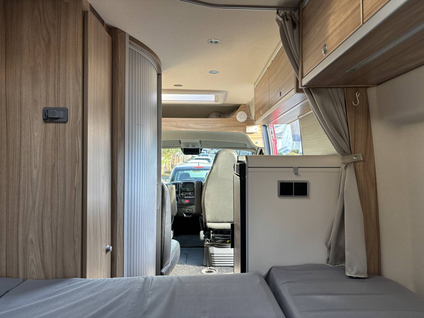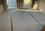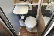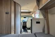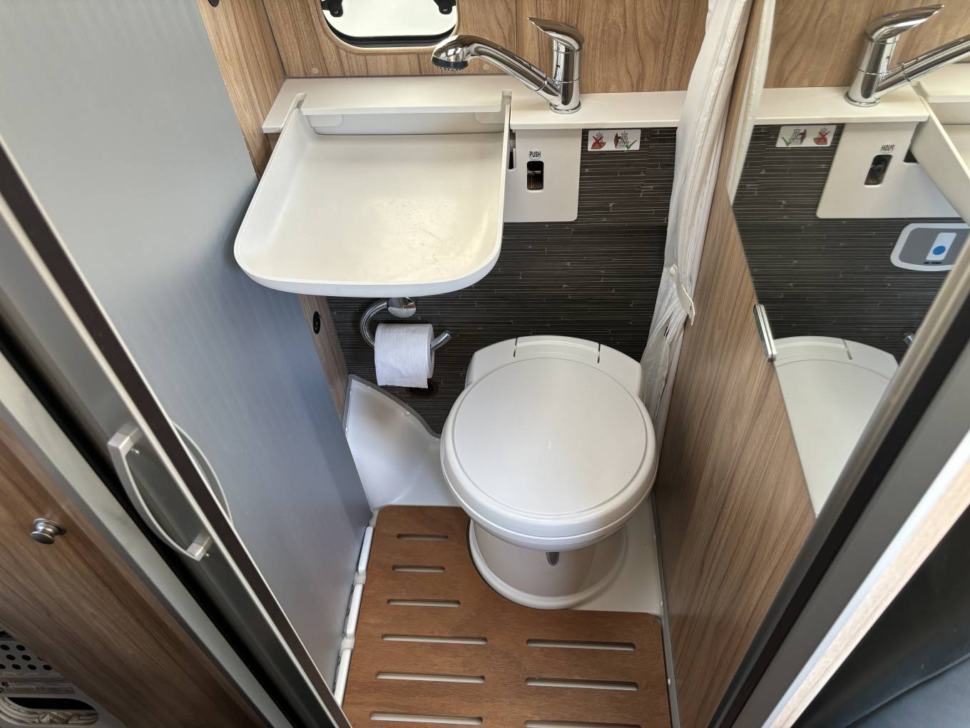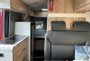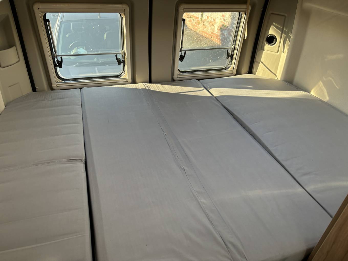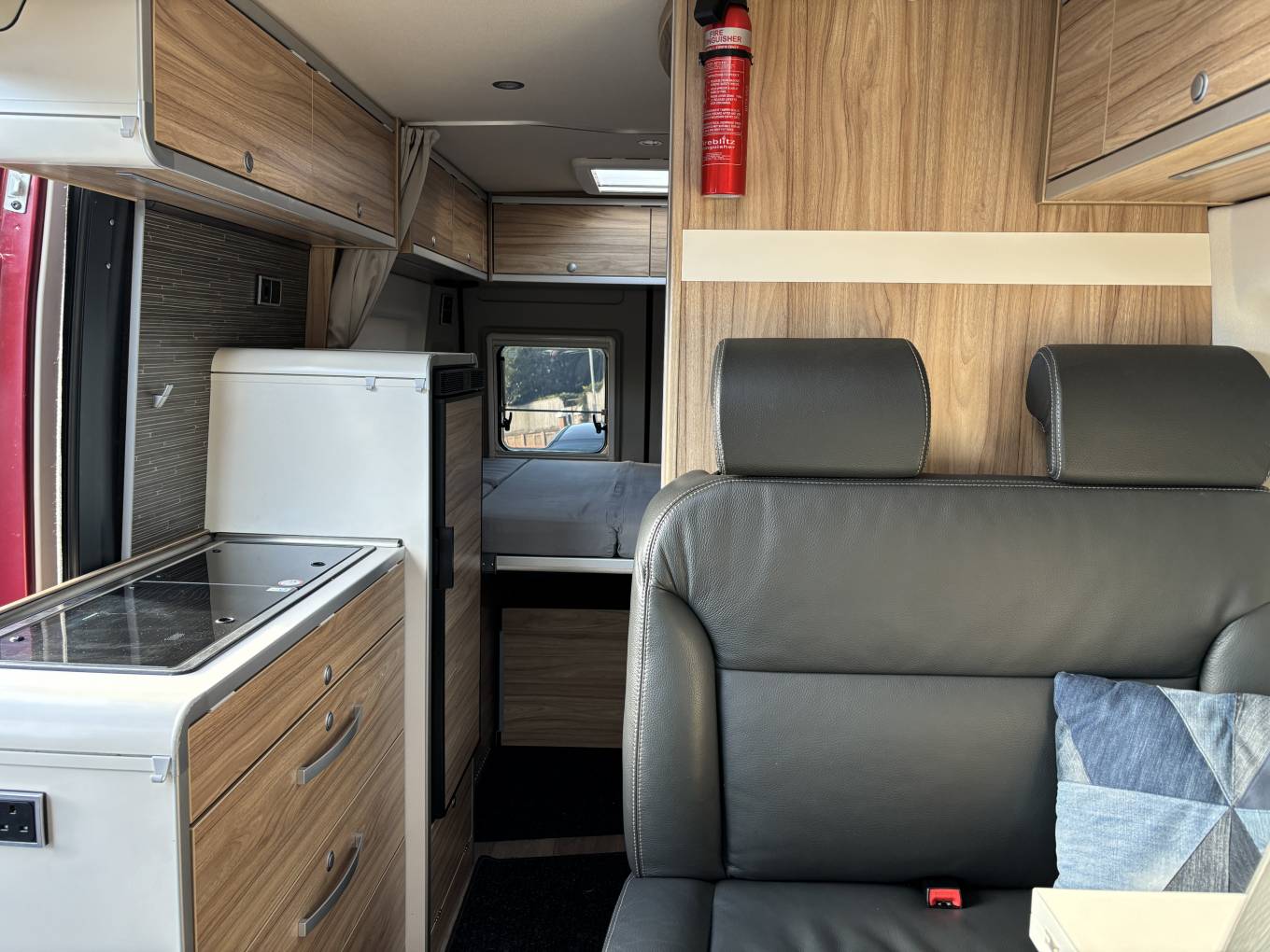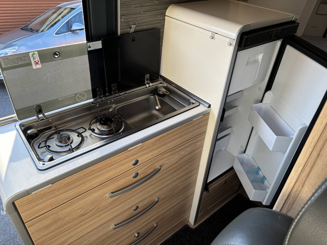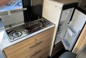 At the rear, you'll find a fixed double bed with a clever lift-up central section, allowing easy access to the large storage area beneath or creating extra interior space when needed. In front of the bed is a compact but well-designed washroom, featuring a fold-down sink, toilet, and shower. Opposite, the kitchen area includes a sink, two gas hobs, and a large fridge with freezer compartment, offering everything you need for life on the road.