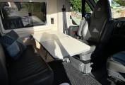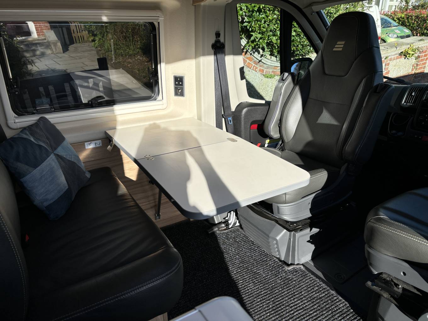 The front dinette includes an adjustable table and is complemented by the two swivel cab seats, allowing comfortable dining and social space for four.