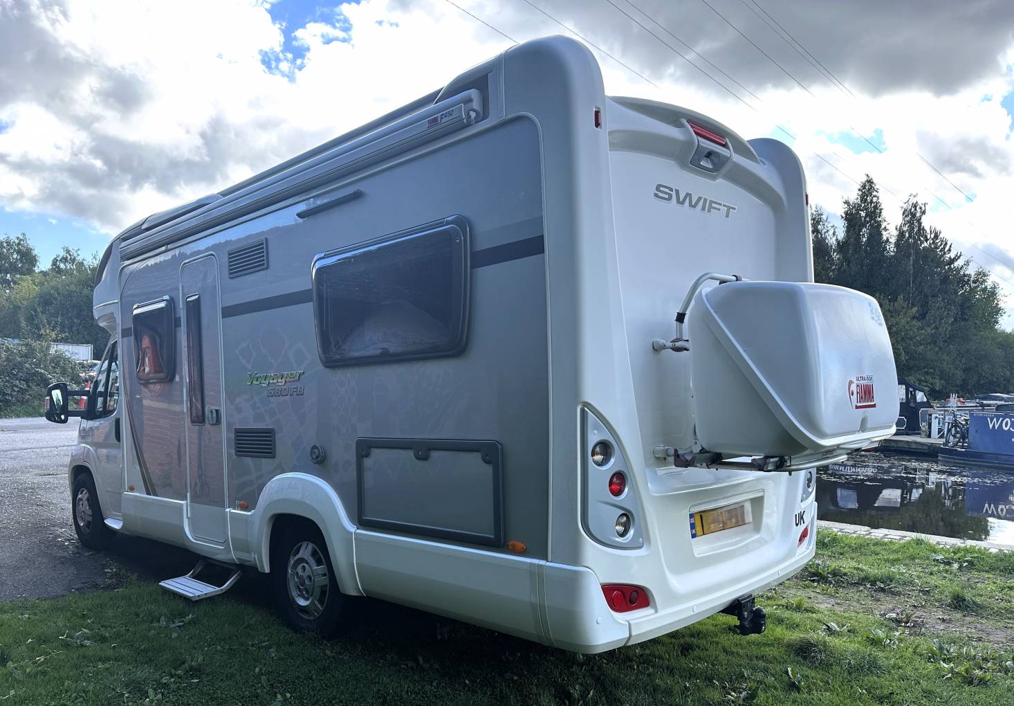 Awning, Bike Rack, Fiamma Storage Box, Tow Bar and Gas Bottle.