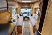 The living space features two long side sofas that convert into a large double or two single beds. The dining area includes a foldable table and swivel captain's chairs, seating up to six. The kitchen is equipped with a 3-way fridge, separate freezer, 3 gas hobs, and 1 electric hot plate. Heating and hot water are provided by a Truma gas and electric system.