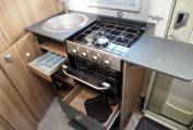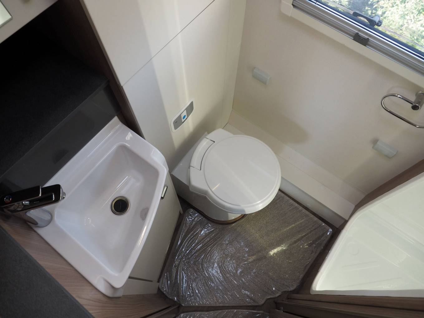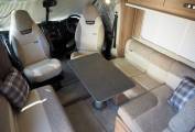 Essentially the layout offers a forward L dinette with opposing side seat, swivel cab seats and a multiposition pedastal table, this area can seat up to 6 for a social. Part of the L base can be removed for passenger legroom and there are 4 seatbelts in total. The lower dinette makes up into a double bed, while the upper roof bed lowers, complete with safety nets and access ladder. Midships you will find a generous kitchen for this size of motorhome with includes gas hob, oven and grill, microwave, storage lockers, a pull up worksurface and free standing draining board. An excellent sized fridge freezer is opposite, while to the rear is the surprisingly roomy washroom with solid lined shower cubicle, deep cupboards and wardrobe, vanity sink and toilet.
