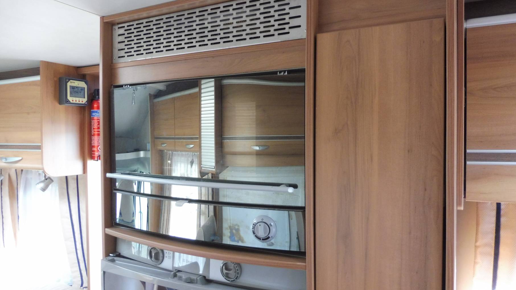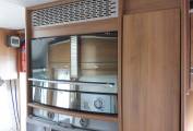 Moving forward there is a well-equipped kitchen with 3-burner hob, combination oven, microwave, 3-way fridge and plenty of storage for crockery, utensils and the like.