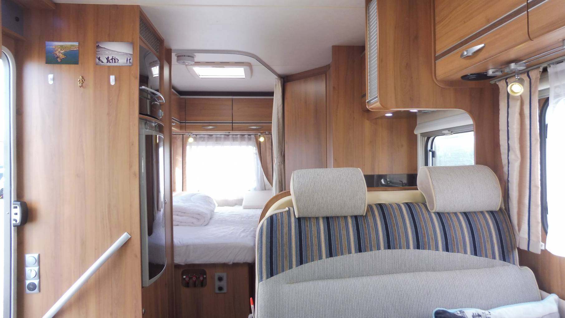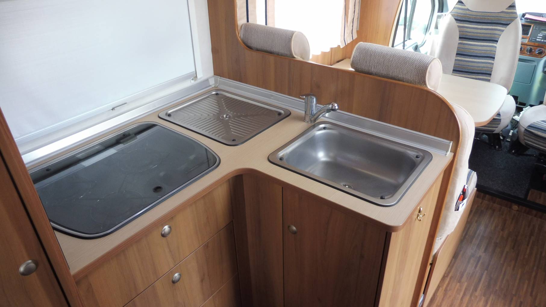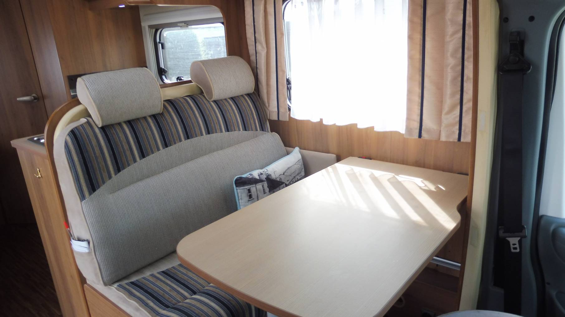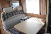 At the front of the motorhome is a roomy lounge with a half-dinette and side sofa which can accommodate six when the driving seats are swivelled; a lovely space to while away the hours. The forward-facing dinette seats house two 3-point seat belts. The cabinetry throughout is the quality you would expect from a German manufacturer. The furnishings have a contemporary feel and are in good condition.