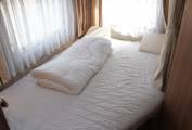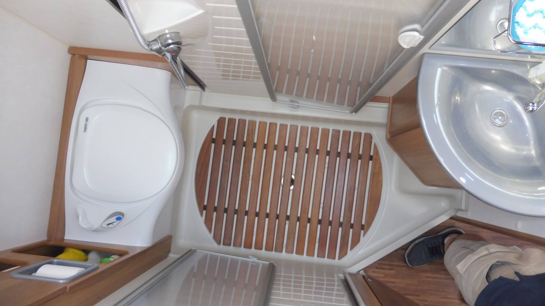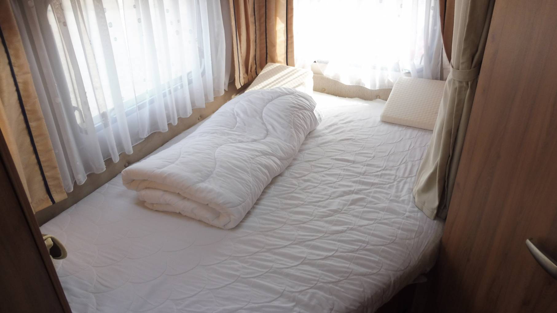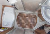 At the rear is a comfortable French bed with storage under and a well-sized washroom alongside. This area can be curtained off for privacy.