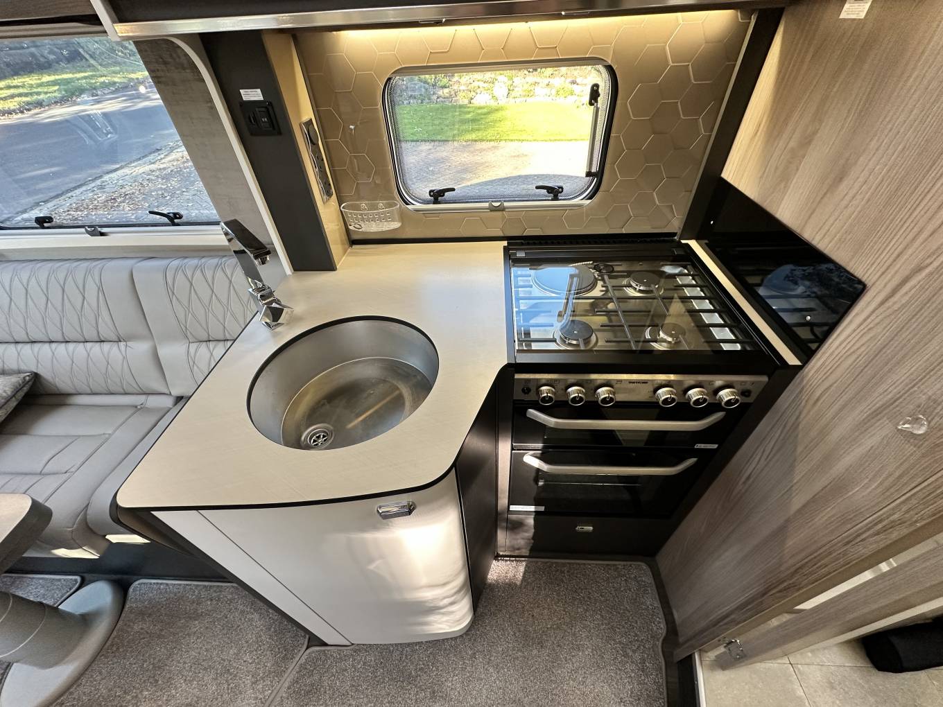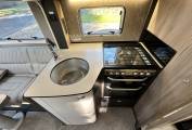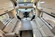 At the rear of the motorhome, you will find the impressive bedroom with height-adjustable island bed, two wardrobes and mood lighting creating a peaceful place to unwind after a days exploring. The Alde heating system provides comfort with hot water and heating. Moving forward you will find the practical washroom including a cassette toilet, a wash basin with mixer tap, vanity unit with large mirror and the desirable separate shower. For added convenience, you can section the bathroom off from both the bedroom and kitchen. Next you will find the well equipped kitchen area including a full oven and grill, a 3-way fridge freezer, a sink with mixer tap, a microwave and plenty of storage. In the heart of the motorhome you will find the light and airy dinette area which comfortably seats up to 6 utilising the front two swivel captain seats. A large electric adjustable table is perfect for dining or relaxing, all set within an atmosphere enhanced by stylish wall storage units and elegant mood lighting. As the night draws in, this effortlessly converts in to a comfortable double bed. There is ample storage throughout the Motorhome including a large garage.