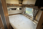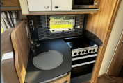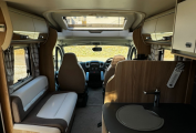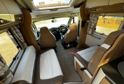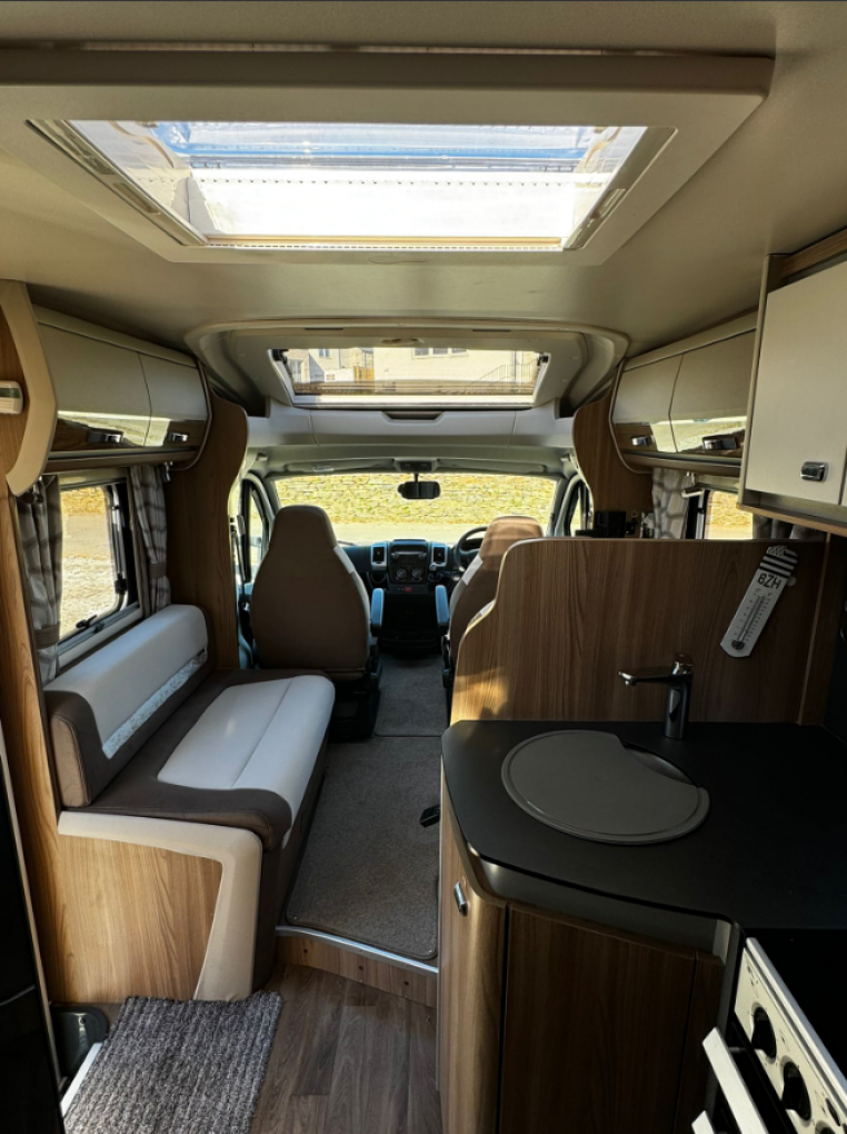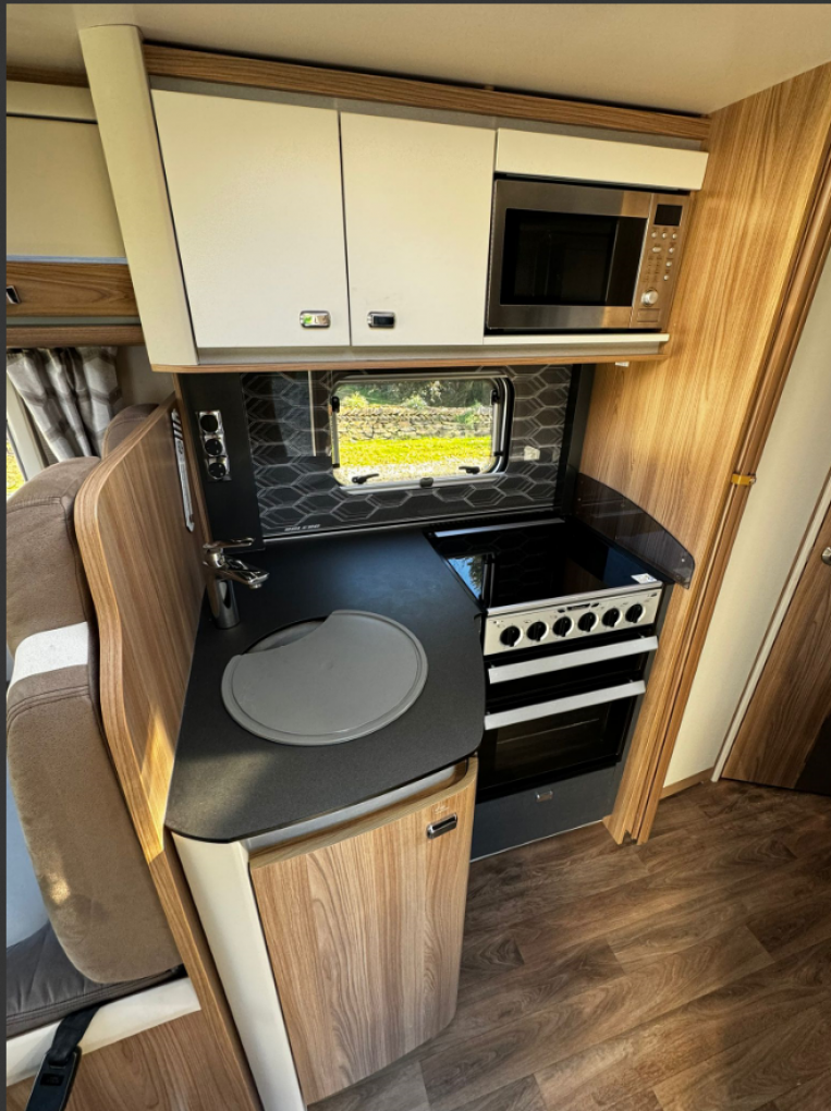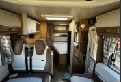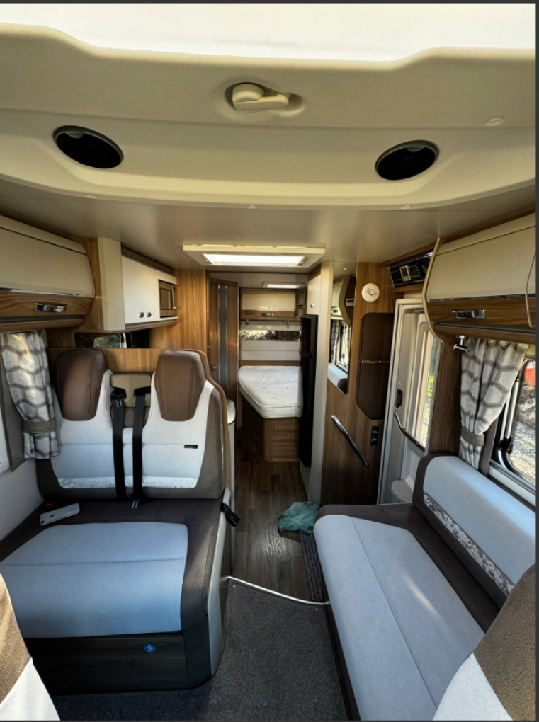 Inside you'll discover a spacious, modern interior designed for practical living and premium comfort. A fixed rear French bed offers restful nights, while the dinette easily converts into a second double bed, making it perfect for couples or families. The well-equipped kitchen includes a 3-way fridge, oven, grill, microwave, and plenty of storage space, making meal preparation a easy.