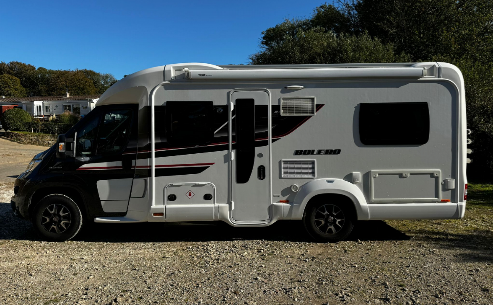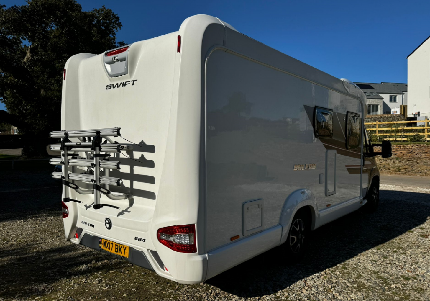 Externally, the Swift Bolero 684FB is just as impressive. Its sleek design, alloy wheels, and wind-out canopy give it a stylish look, while a solar panel provides off-grid power. A 4-bike rack allows you to bring bicycles along for added adventures, and parking is simple with the included reversing camera.