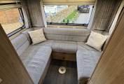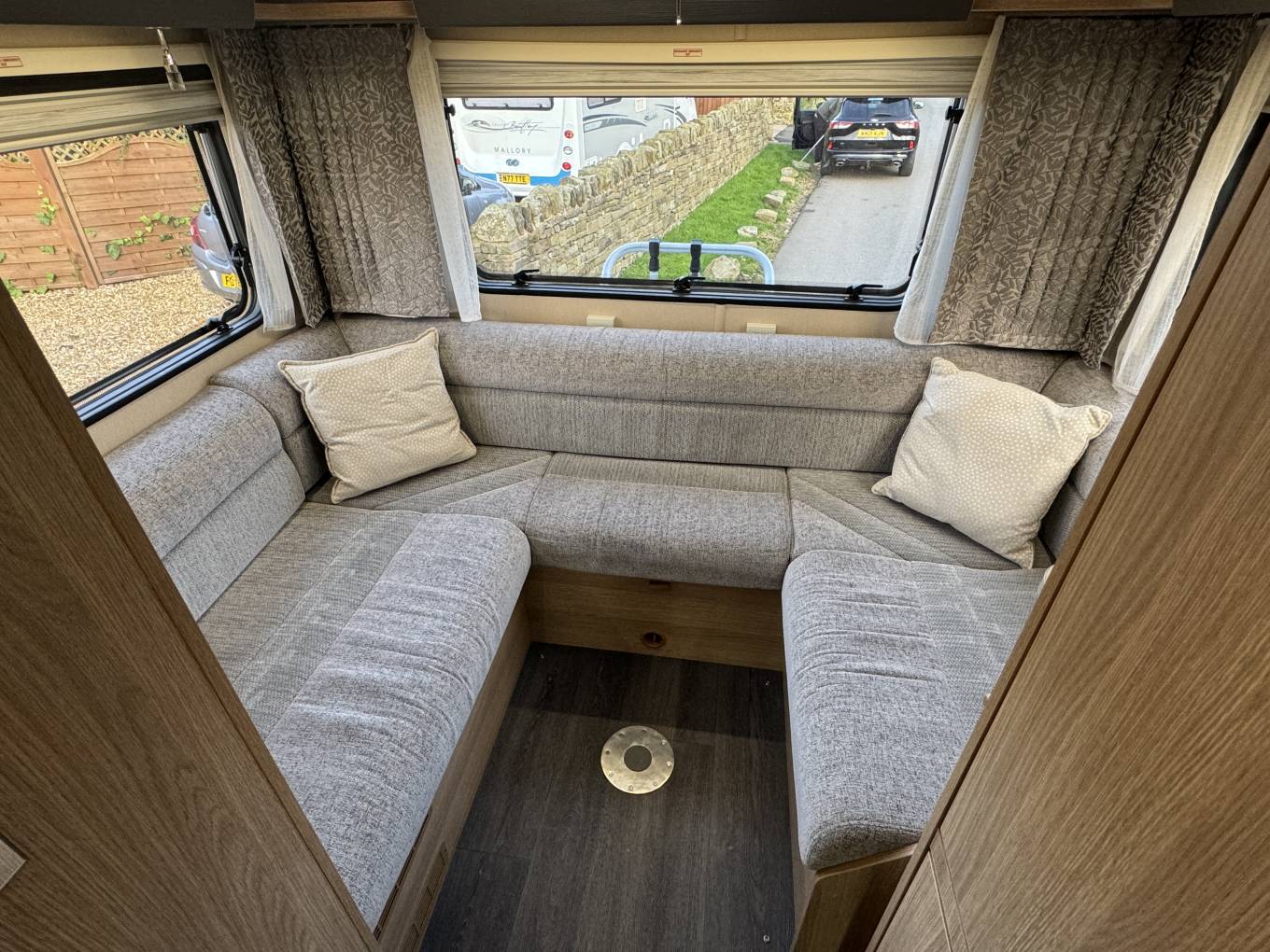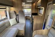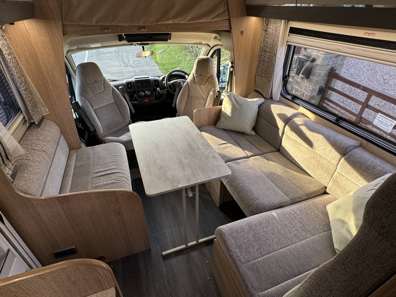Opposite the kitchen is incredibly spacious central dinette and is flooded with light making it a fabulous spot to relax and unwind in. There is a forward facing 2 seater sofa with 2 seat belts that forms part of a large L shape sofa. Opposite is a side facing sofa that also converts to form part of the large double bed.