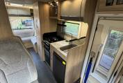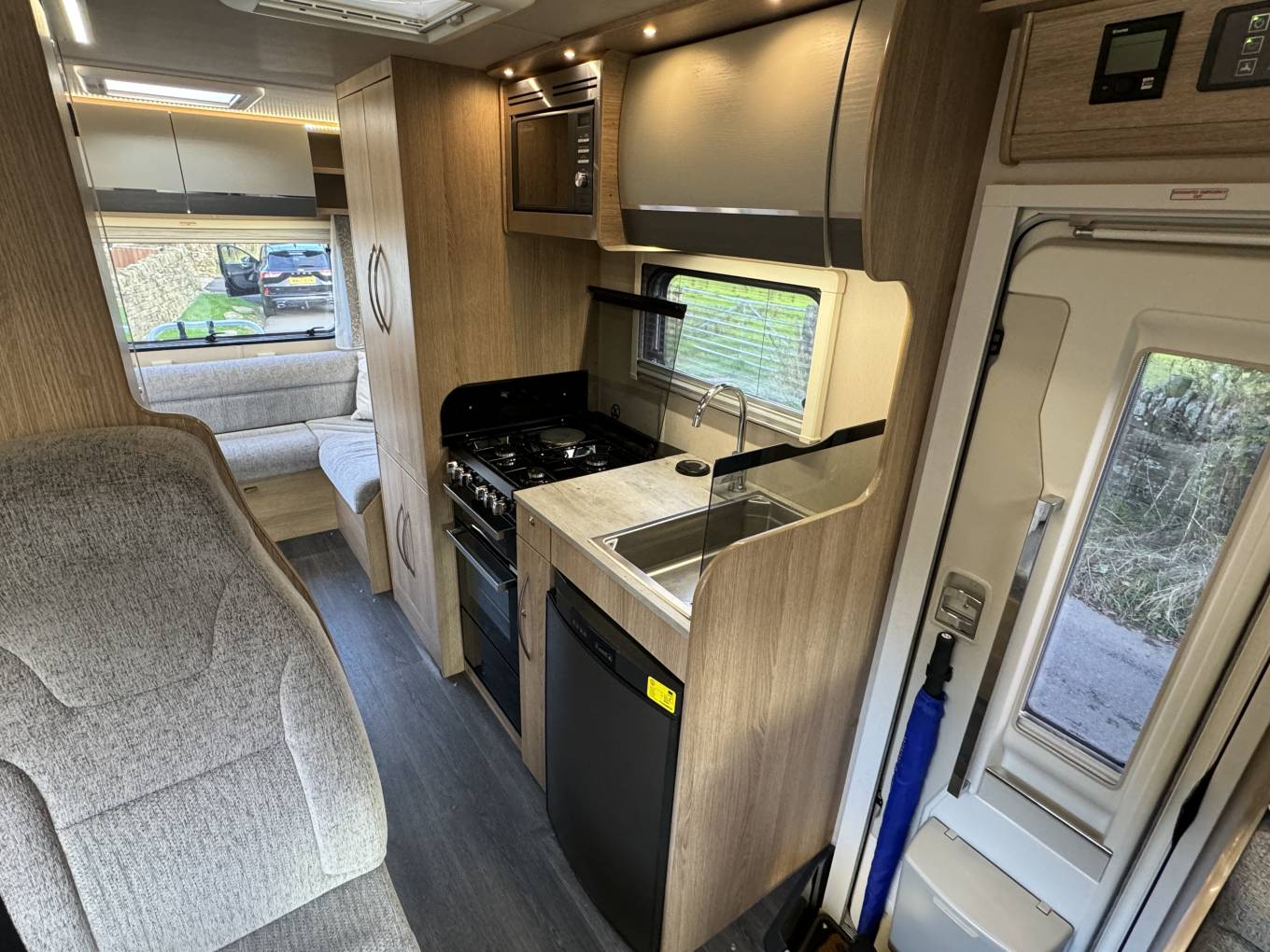Carrying on through, you come to the kitchen which has everything you need to rustle up a lovely meal. There is a 3 gas ring and 1 electric burner hob, a Thetford oven with grill, a large Dometic 3 way fridge freezer, a sink with mixer tap, a microwave and lots of storage space for utensils and ingredients plus a good work top area.