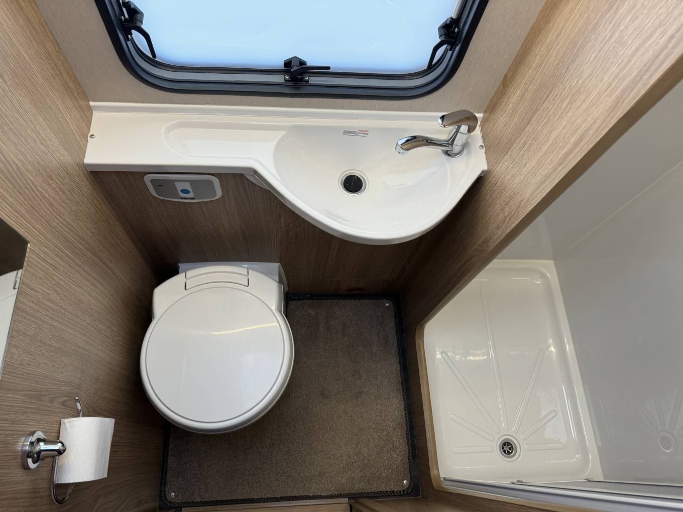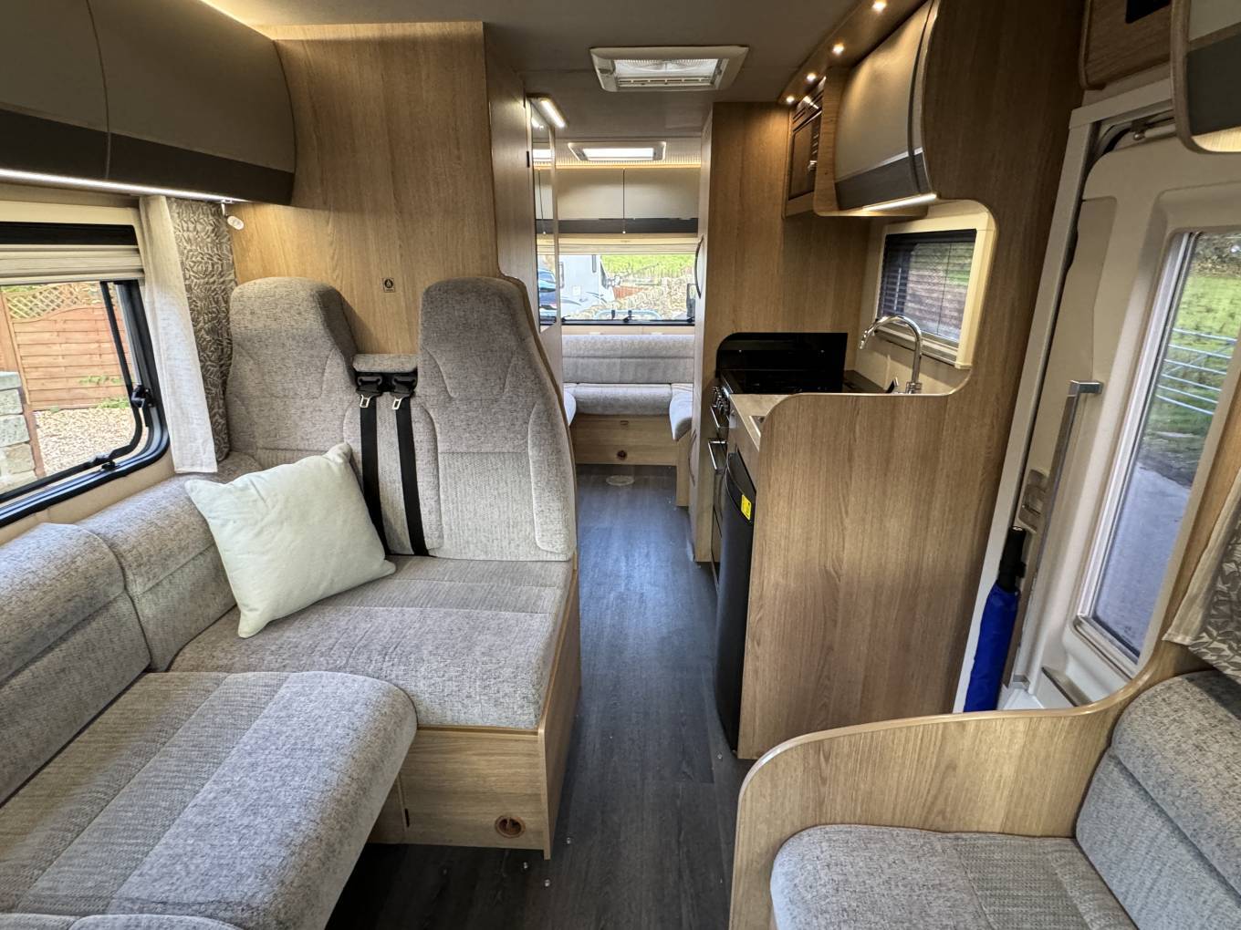 As you enter the motorhome you have the highly desired rear lounge layout featuring a large table, tv point with aerial and plenty of overhead storage. The rear lounge is flooded with lots of natural light thanks to the large rear and side windows and roof light.