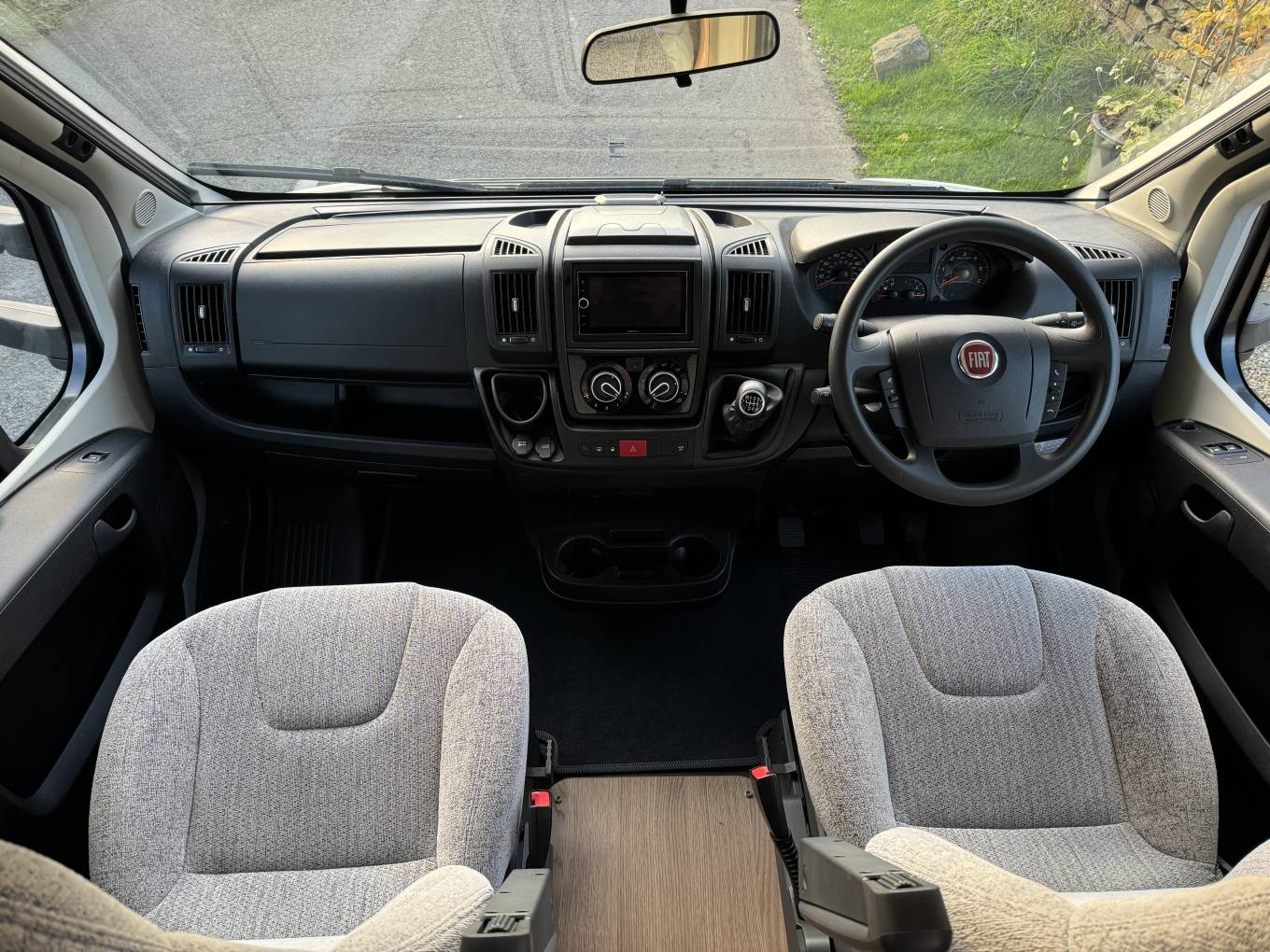 In the cab, the vehicle has a manual 6 speed gearbox, a state of the art reversing camera, radio, sat nav, bluetooth phone and air conditioning. There are also electric windows and mirrors. Externally there is a wind out awning to allow al fresco dining and external storage lockers.
