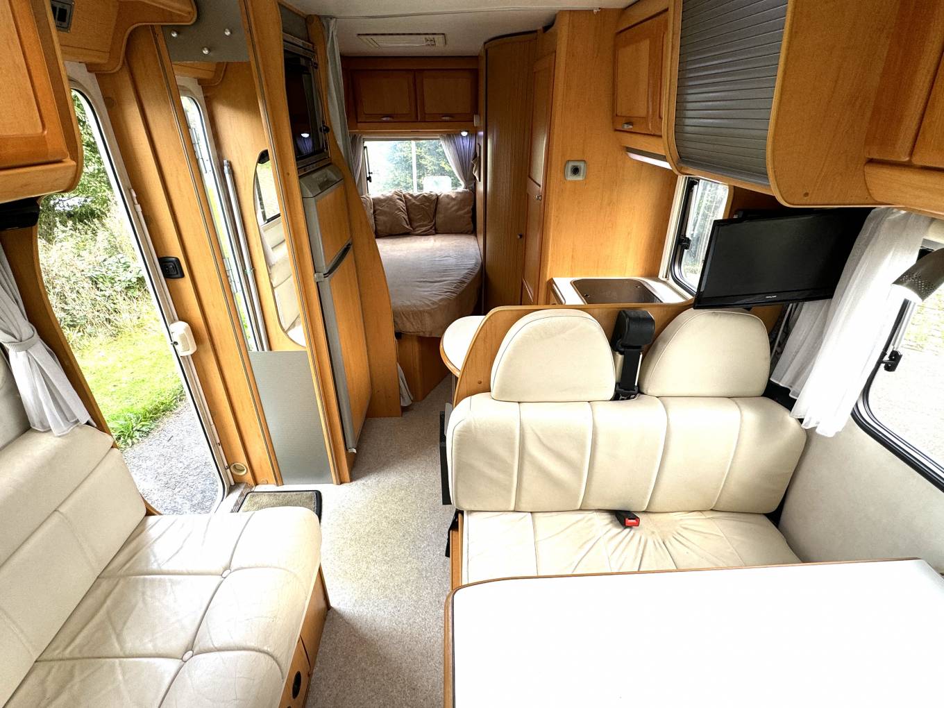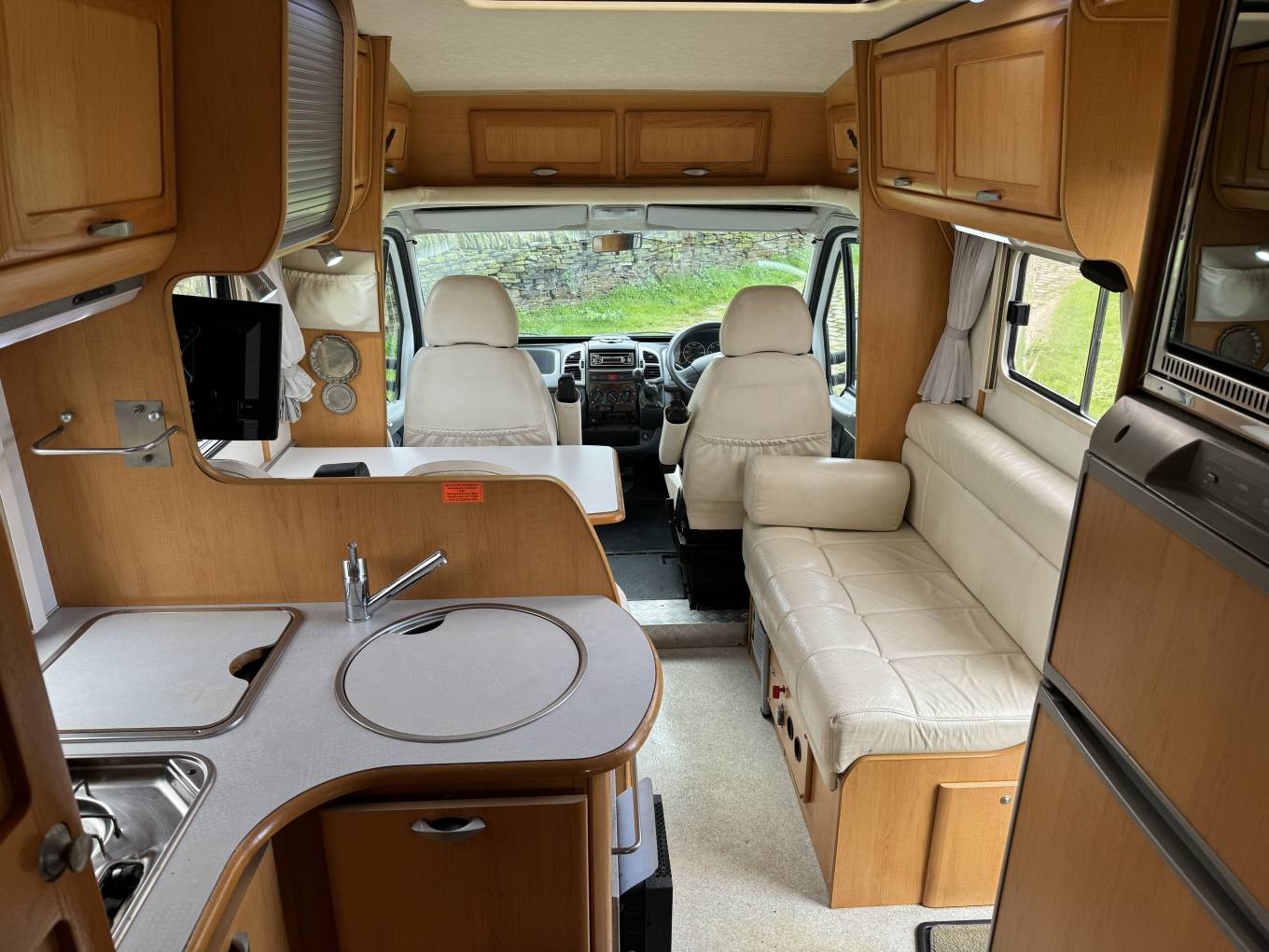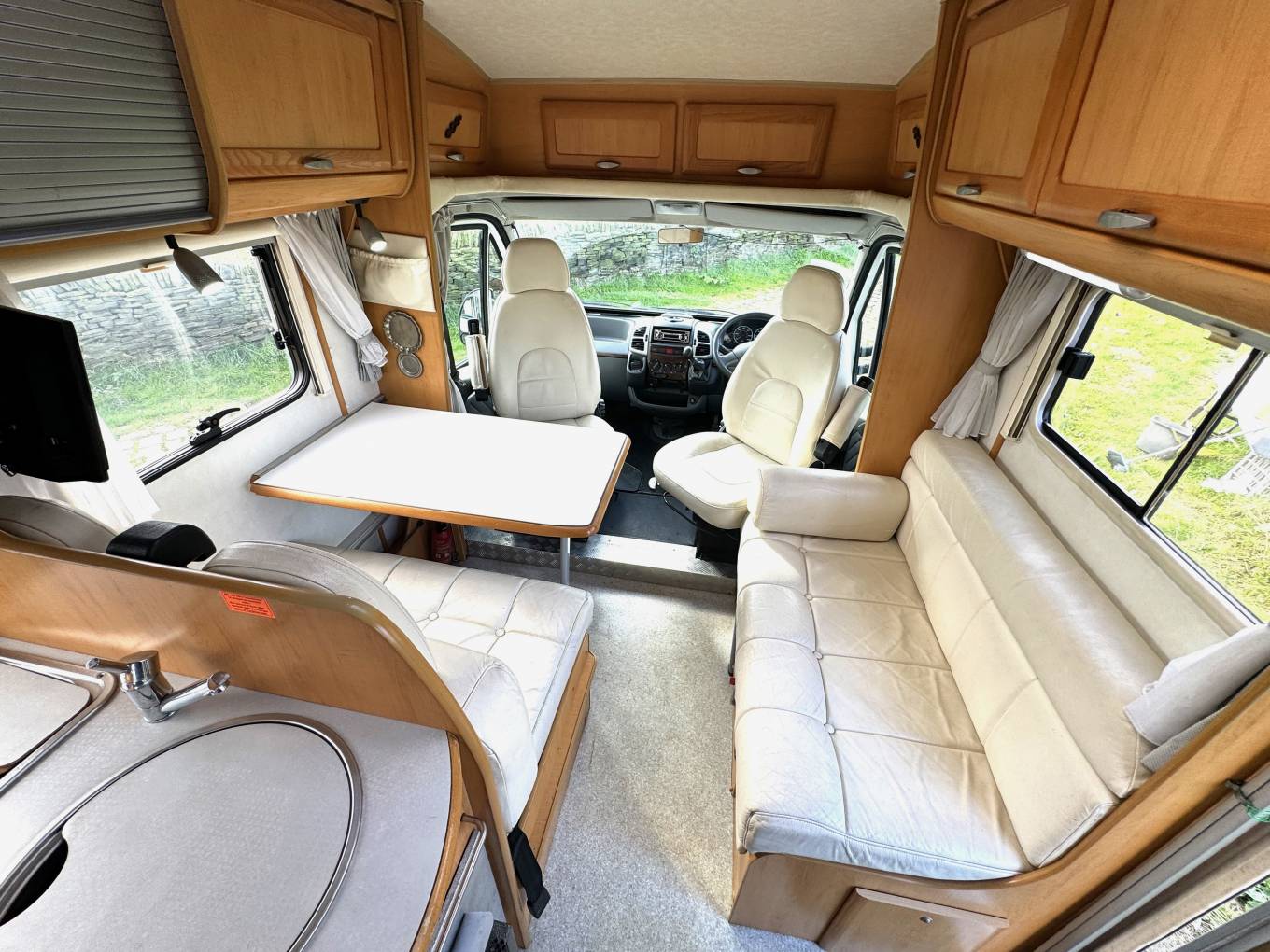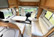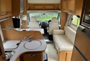 One of the standout features of this Hymer is its spacious interior. The front swivel seats enhance the open feel, complemented by cheerful, light-coloured furnishings that are in excellent condition. The centre lounge area includes two rear travel seats and a single sofa on the left, all of which can be easily reconfigured to create a comfortable second double bed, making it versatile for guests or family.