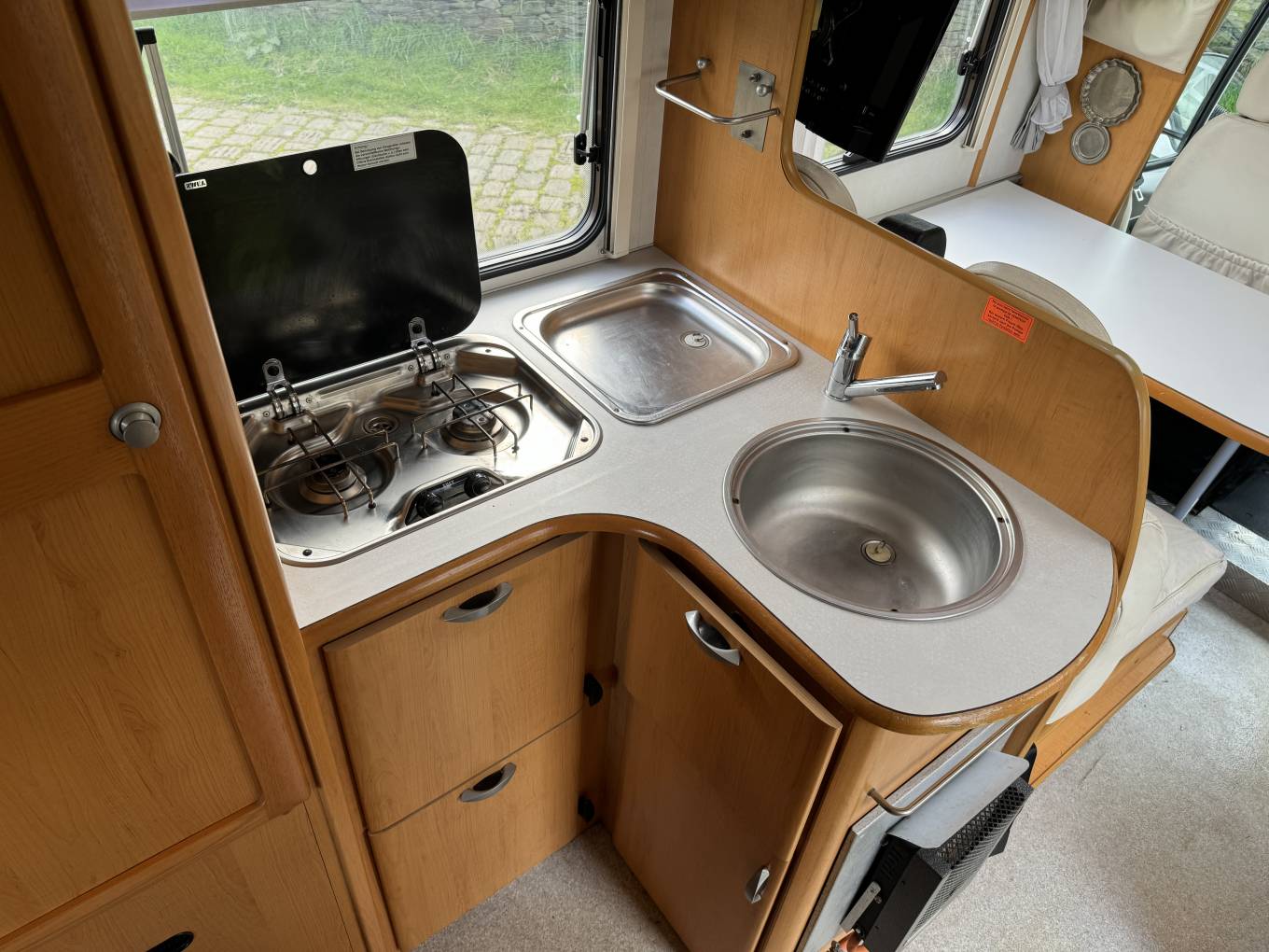 Moving to the heart of the motorhome, the kitchen is fully equipped for culinary adventures. It features a 3-ring gas hob, with gas supplied from the exterior storage unit. The sink, complete with a draining board, is conveniently located next to the hob, and beneath it are several drawers for easy access to utensils and cooking essentials. Opposite the kitchen, you’ll find a large Dometic fridge with a separate freezer compartment, perfect for storing your food and drinks while on the road.