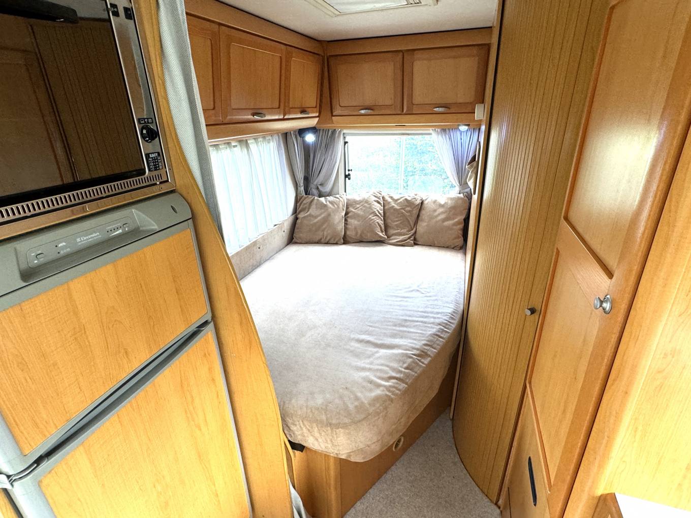 Starting with the rear of the motorhome, you have a wonderfully presented rear fixed french bed surrounded by multiple spot lights with plenty of storage space in the overhead cupboards. Adjacent and behind the bed is the large bathroom which includes a full length shower, sink with cupboards and toilet.