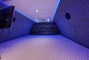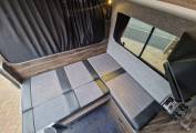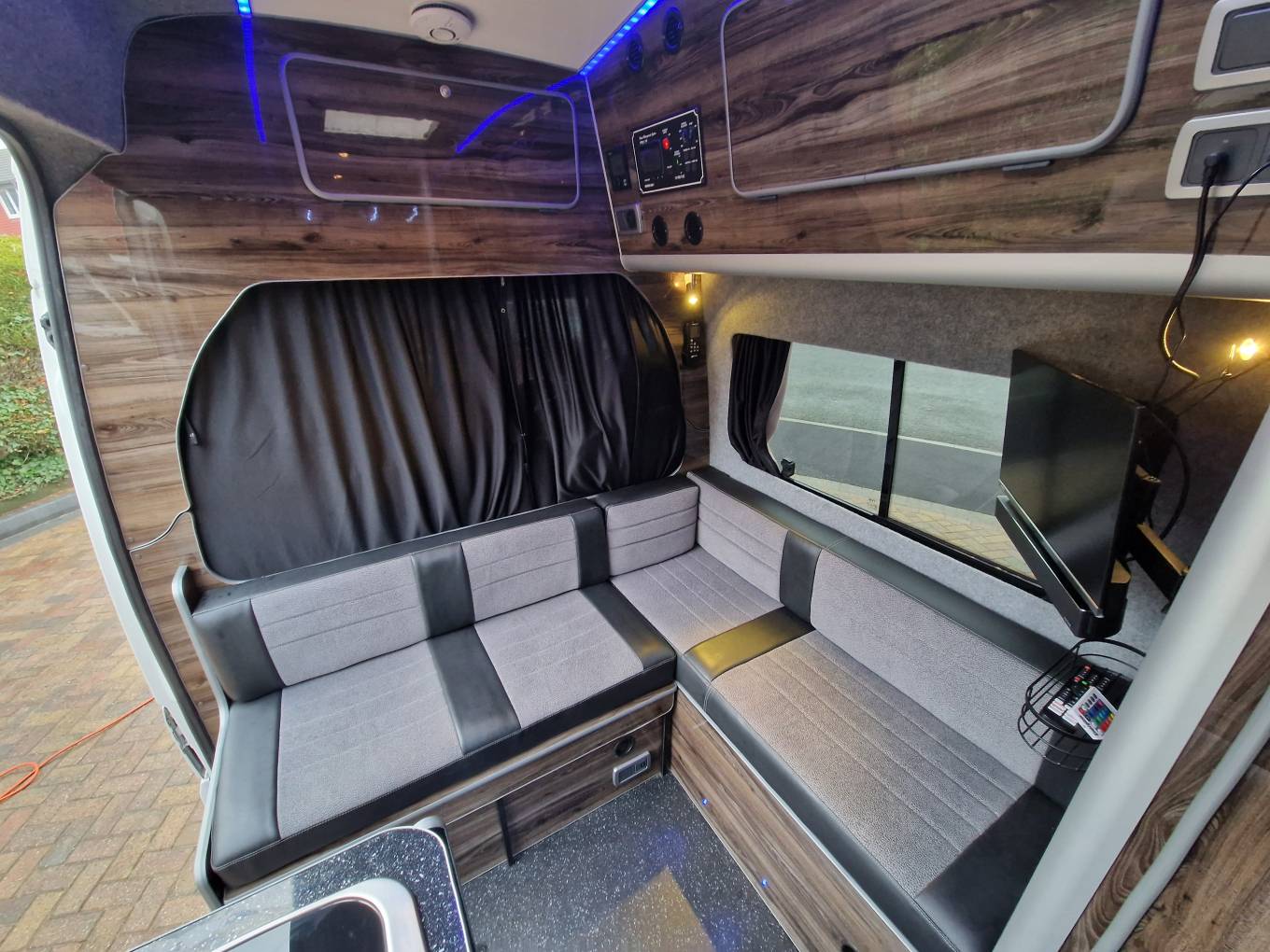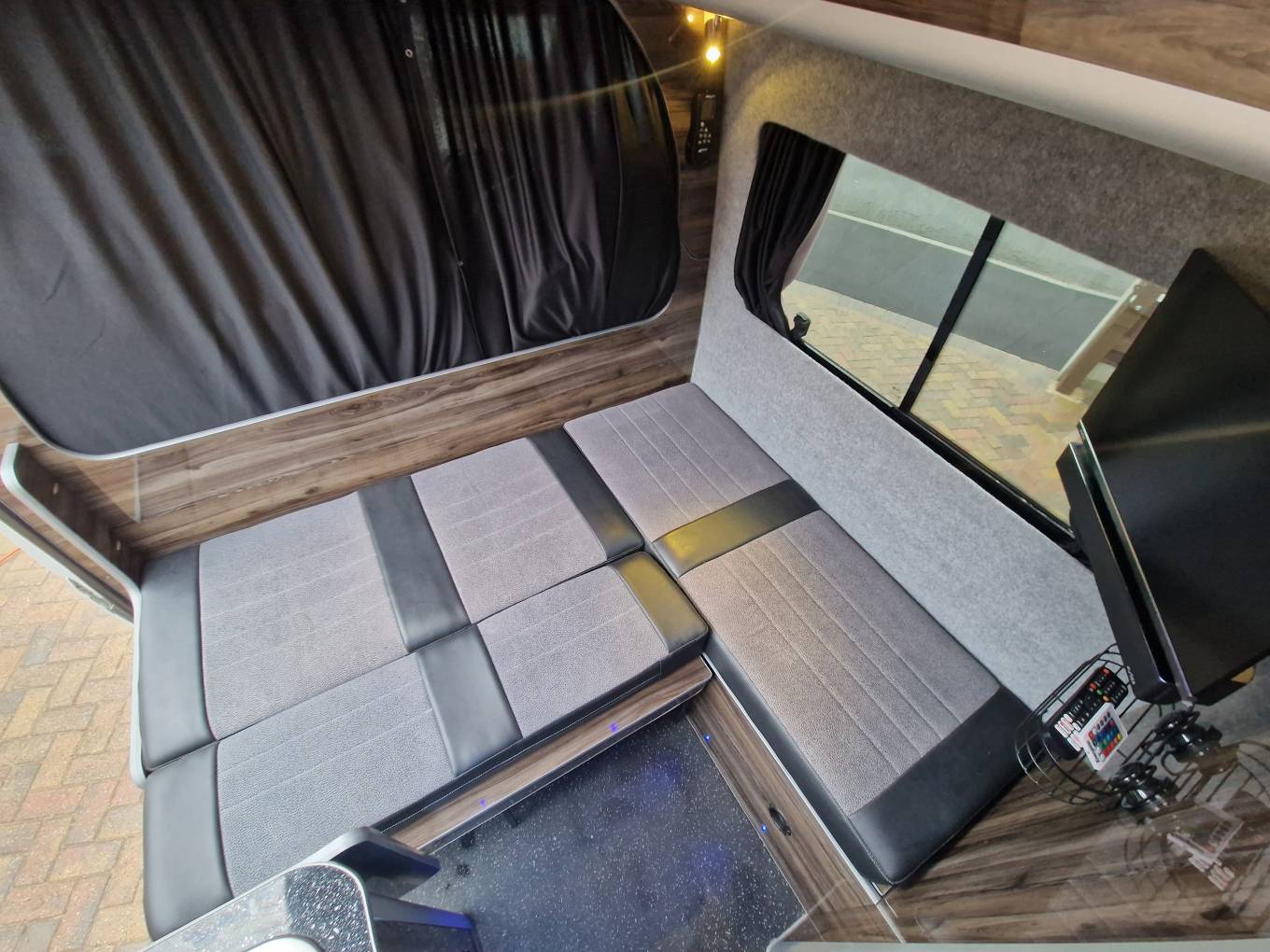 greeted by the L shaped lounge area that converts into a bed for night time, there’s