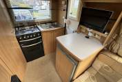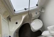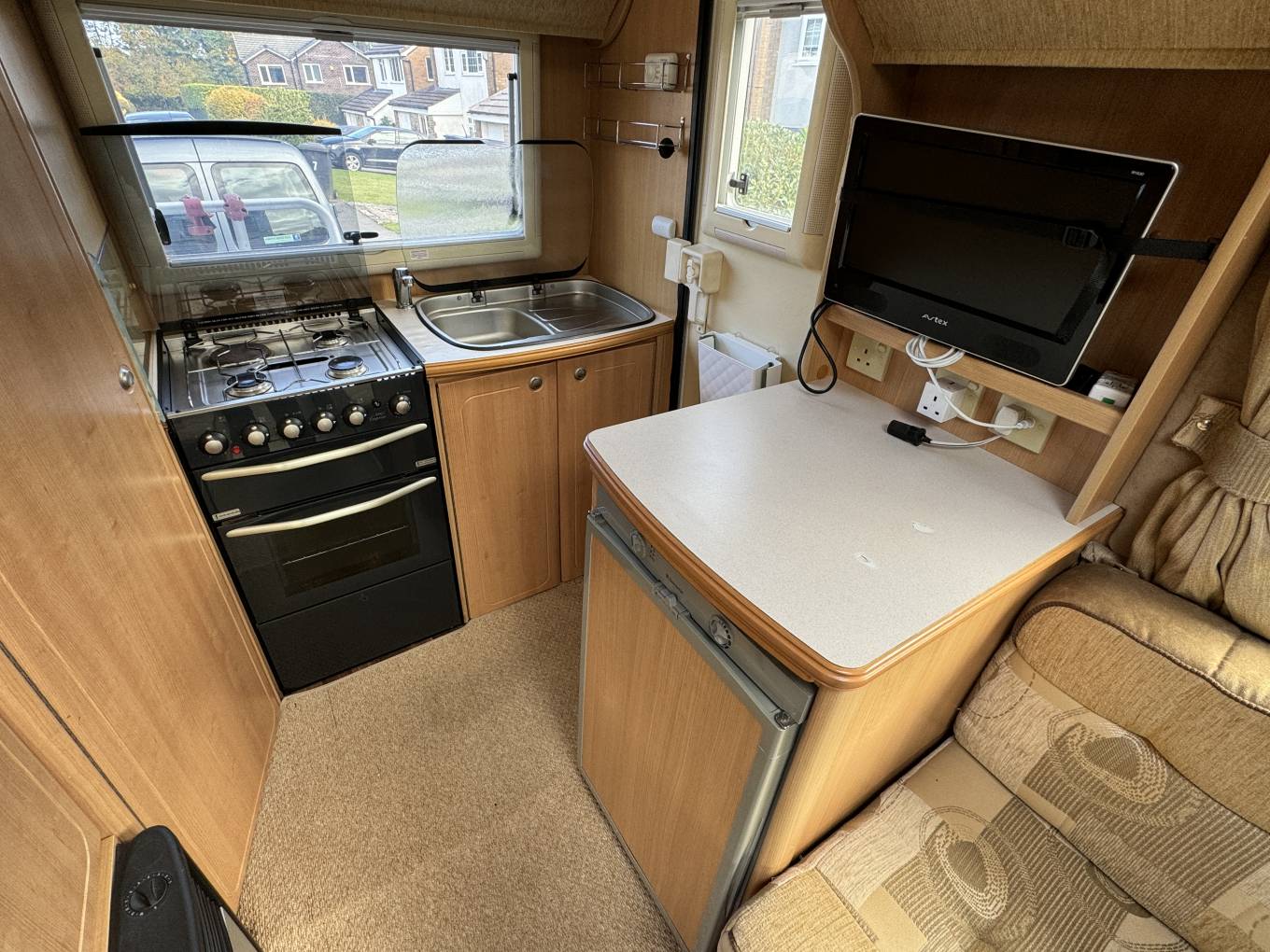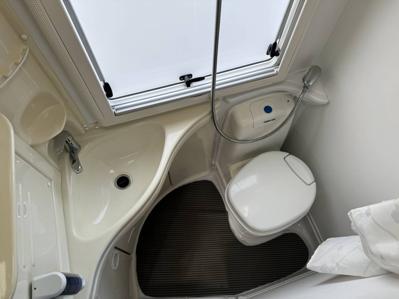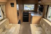 Adjacent to the kitchen is the well-appointed washroom, featuring a Thetford cassette toilet, a sink with both hot and cold taps, and a shower, providing all the comforts of home while you're on the go.
