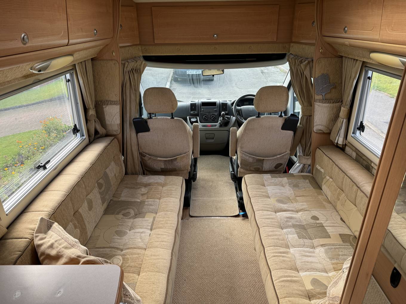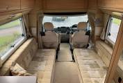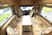 As you enter the front of the motorhome, you'll appreciate the two swivel seats that can easily face the central lounge area, enhancing the social atmosphere. The cab is equipped with modern conveniences, including air conditioning, and a radio. Additional features include electric windows and mirrors, making this motorhome not only luxurious but also user-friendly.