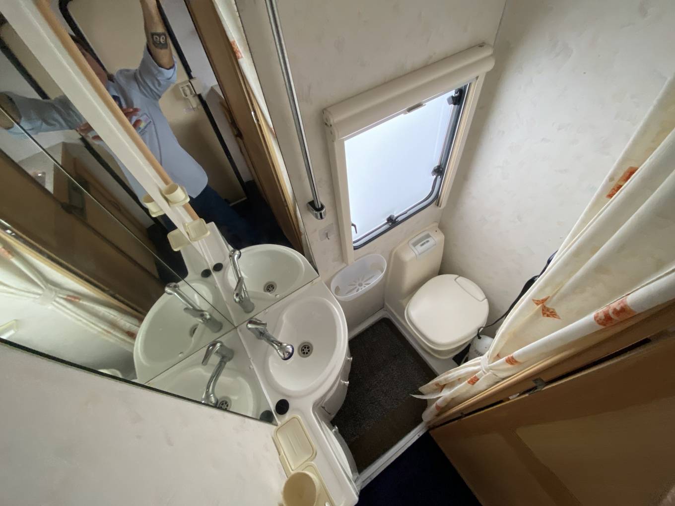 over the hot water storage and Truma gas heater opposite a dresser unit, while