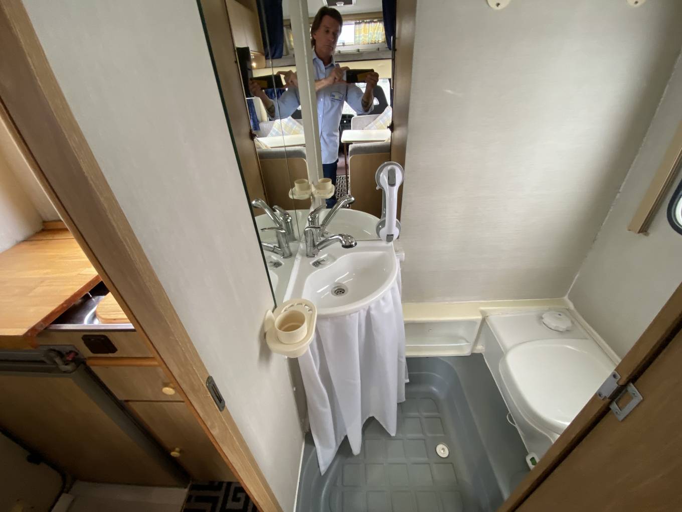 with toilet, sink, shower and storage (new tap and sink has just been fitted)