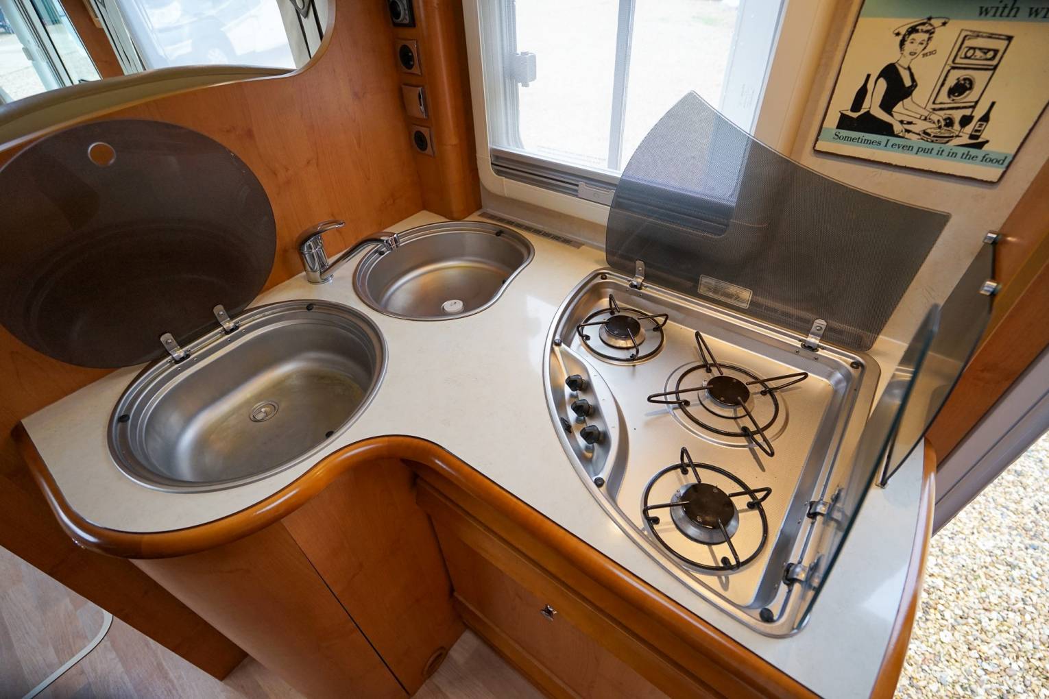 sinks, Chrome Mixer tap, 3 Burner hob and Extractor fan with lots of storage