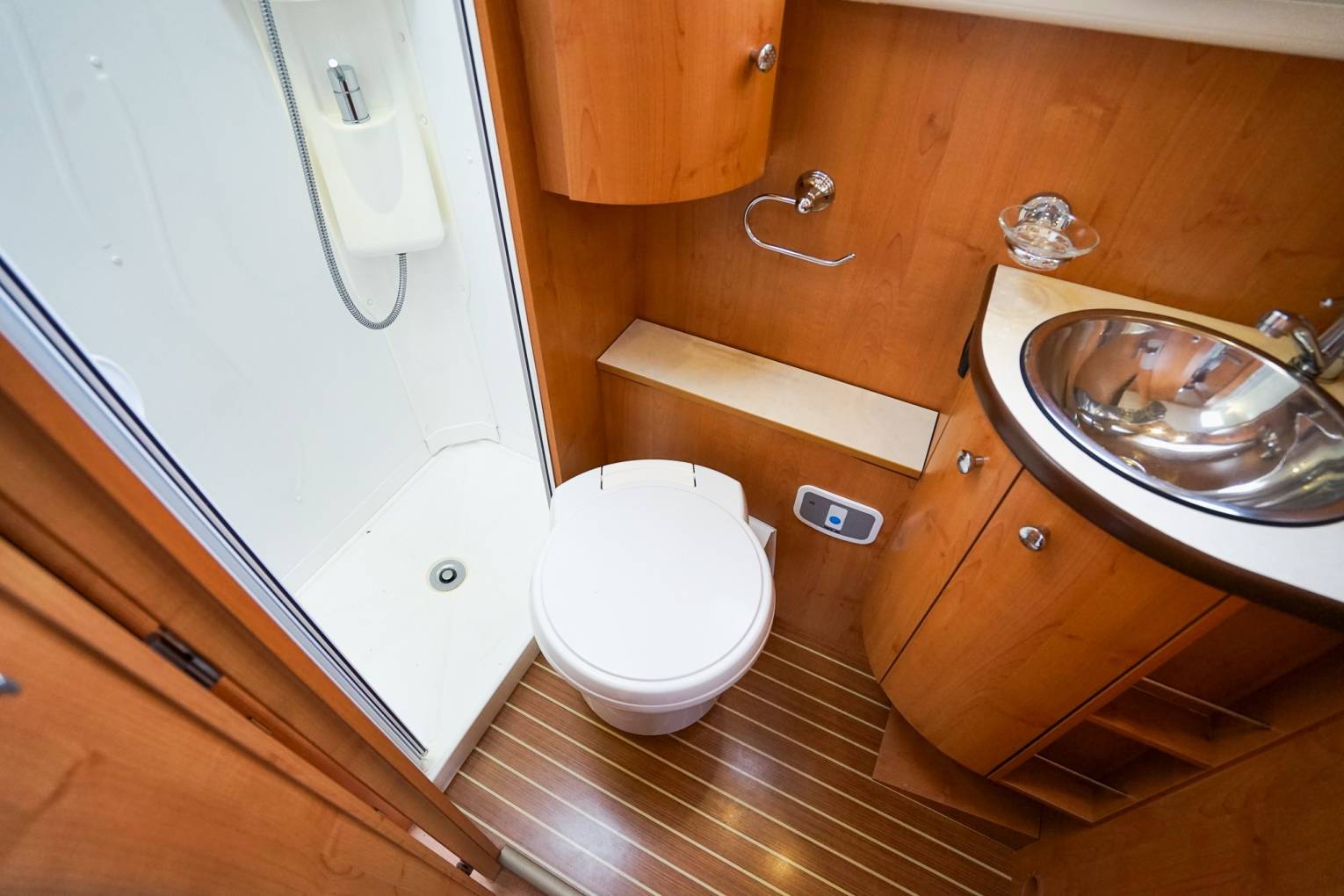 The Luxury rear washroom has a Cassette Toilet, stainless