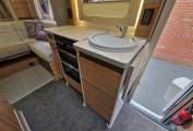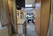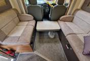 On entering the habitation door on the nearside there is a dining area/lounge to the left with 2 swivel seats, a dining table and 2 forward facing passenger seats concealed below the opposing settees which can be made up into a double bed. The cab has a large roofvent above and there are integral cab blinds to the windows.
