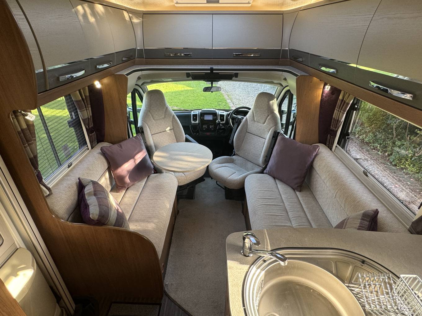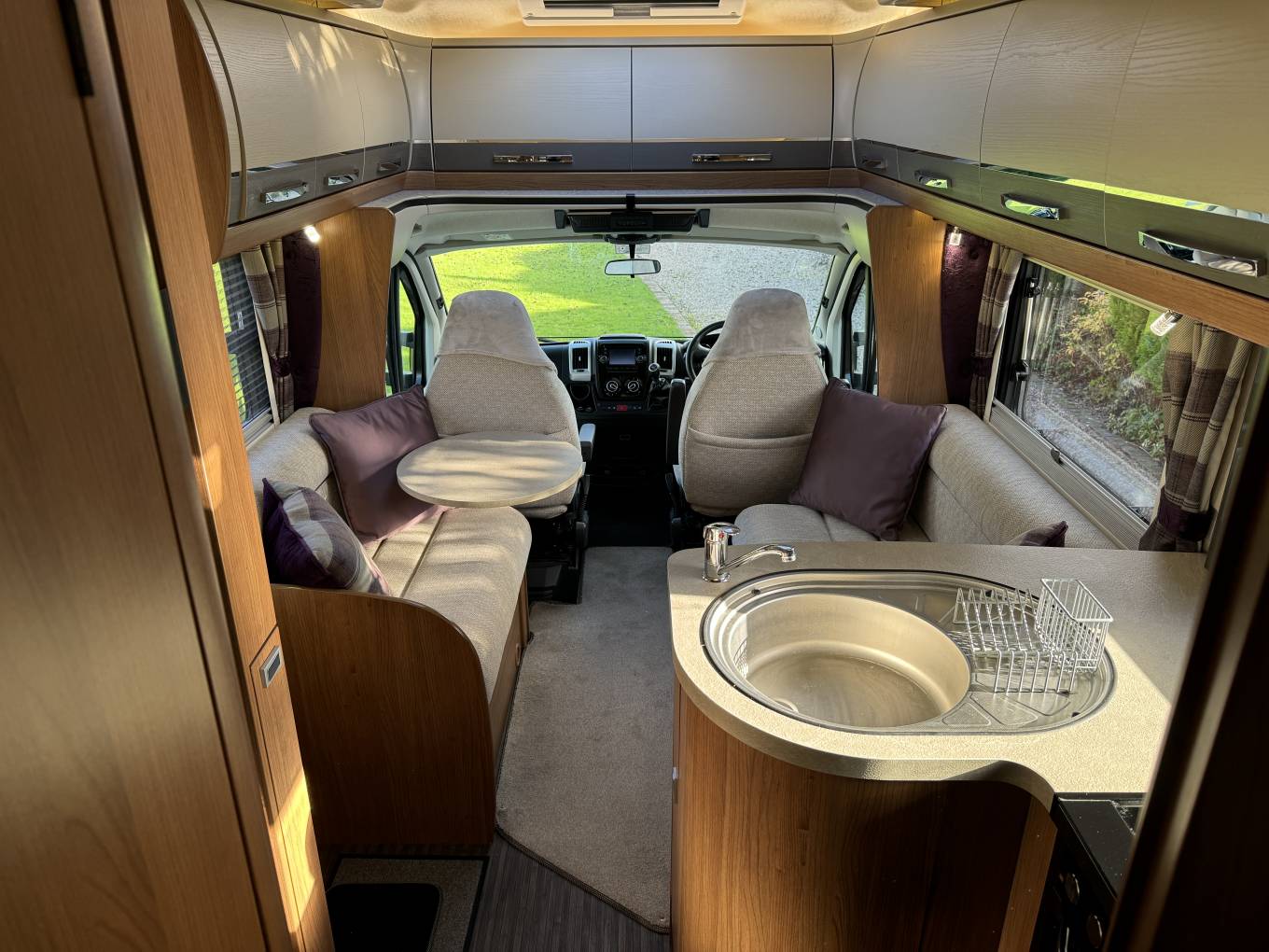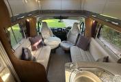 Moving towards the front of the motorhome is the incredibly spacious lounge area that is flooded with natural light making it a fabulous spot to relax and unwind in. Along with the swivelled driver and passenger seats, you have the highly desirable side benches. Together these side benches convert to make the second large double bed. There is also a dining table that can positioned in between.