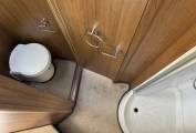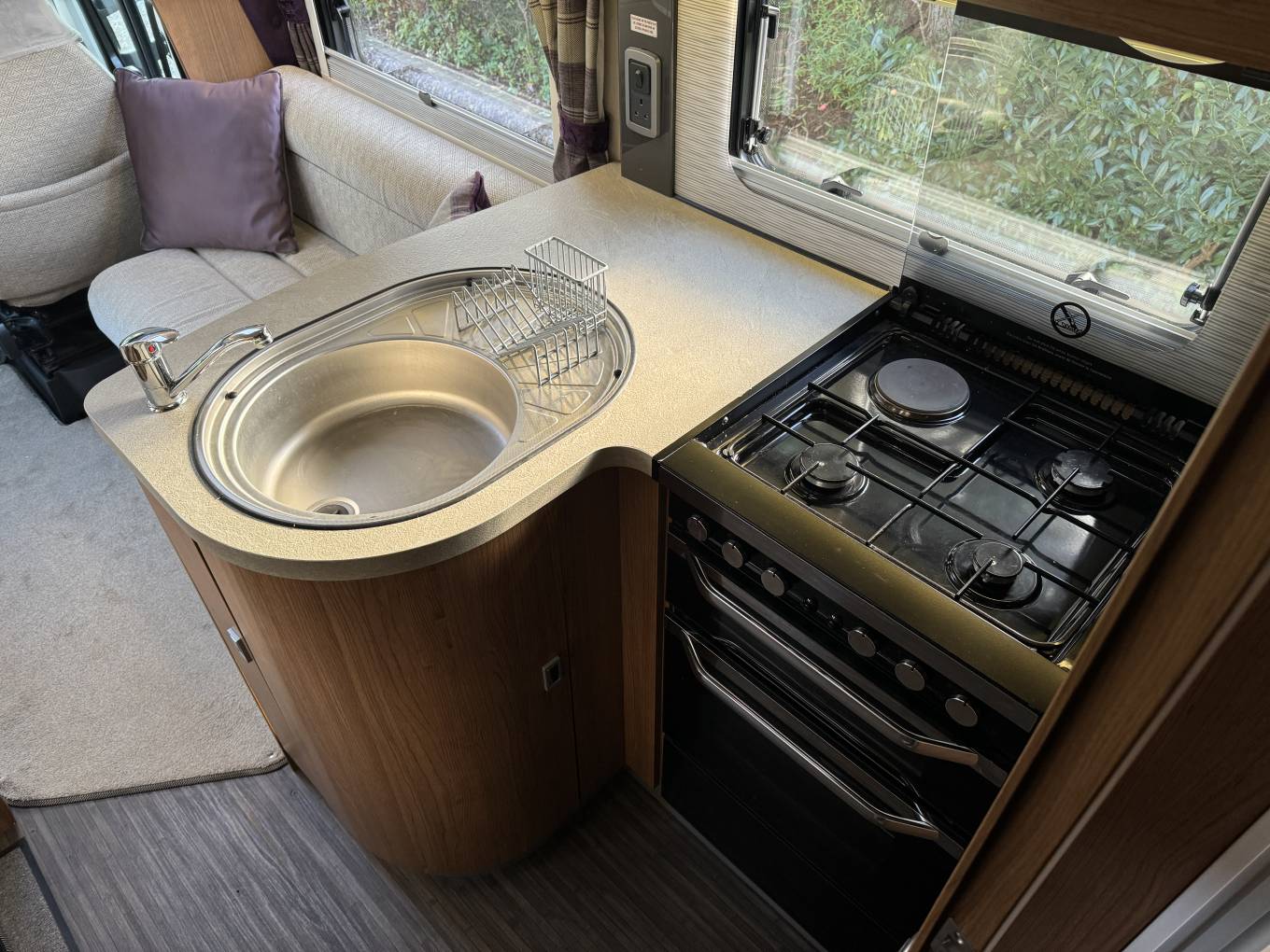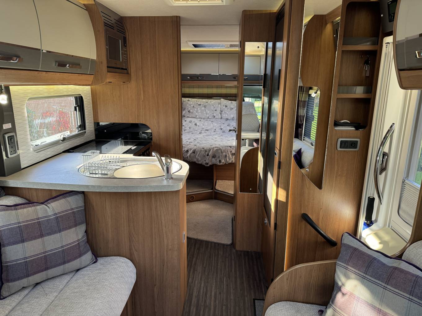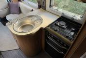 Carrying on through, you come to the kitchen which has everything you need to rustle up a lovely meal. There is a 3 gas ring and 1 electric burner hob, a Thetford oven with grill, a large full length Dometic fridge with freezer compartment, a stainless steel sink with mixer tap and lots of storage space for utensils and ingredients plus a good work top area.