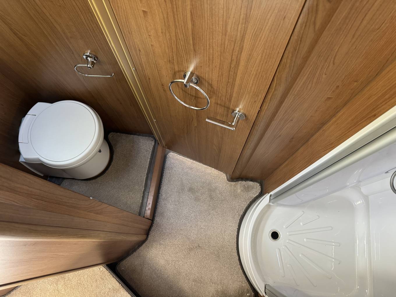 As we move through the motorhome, you have the well sort after large washroom which consists of a full length separate shower on one side and opposite is the toilet, washbasin, storage cupboards and shelves with a good sized mirror opposite. The door can also be used to make this space in to one large washroom and closed off from the front half of the motorhome to offer you that extra required privacy.