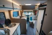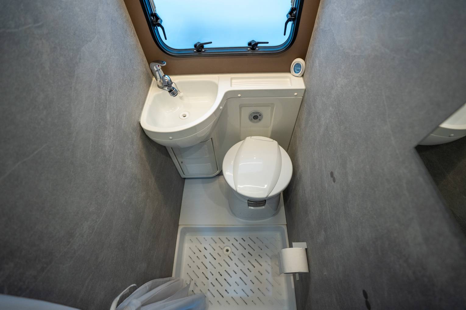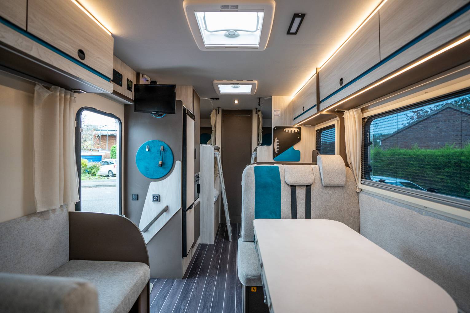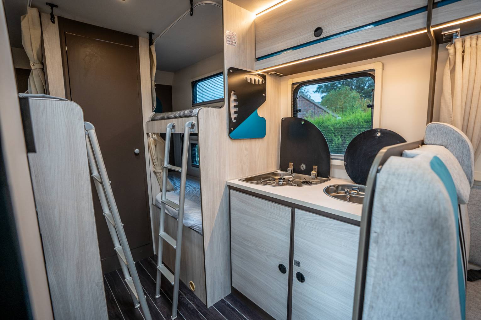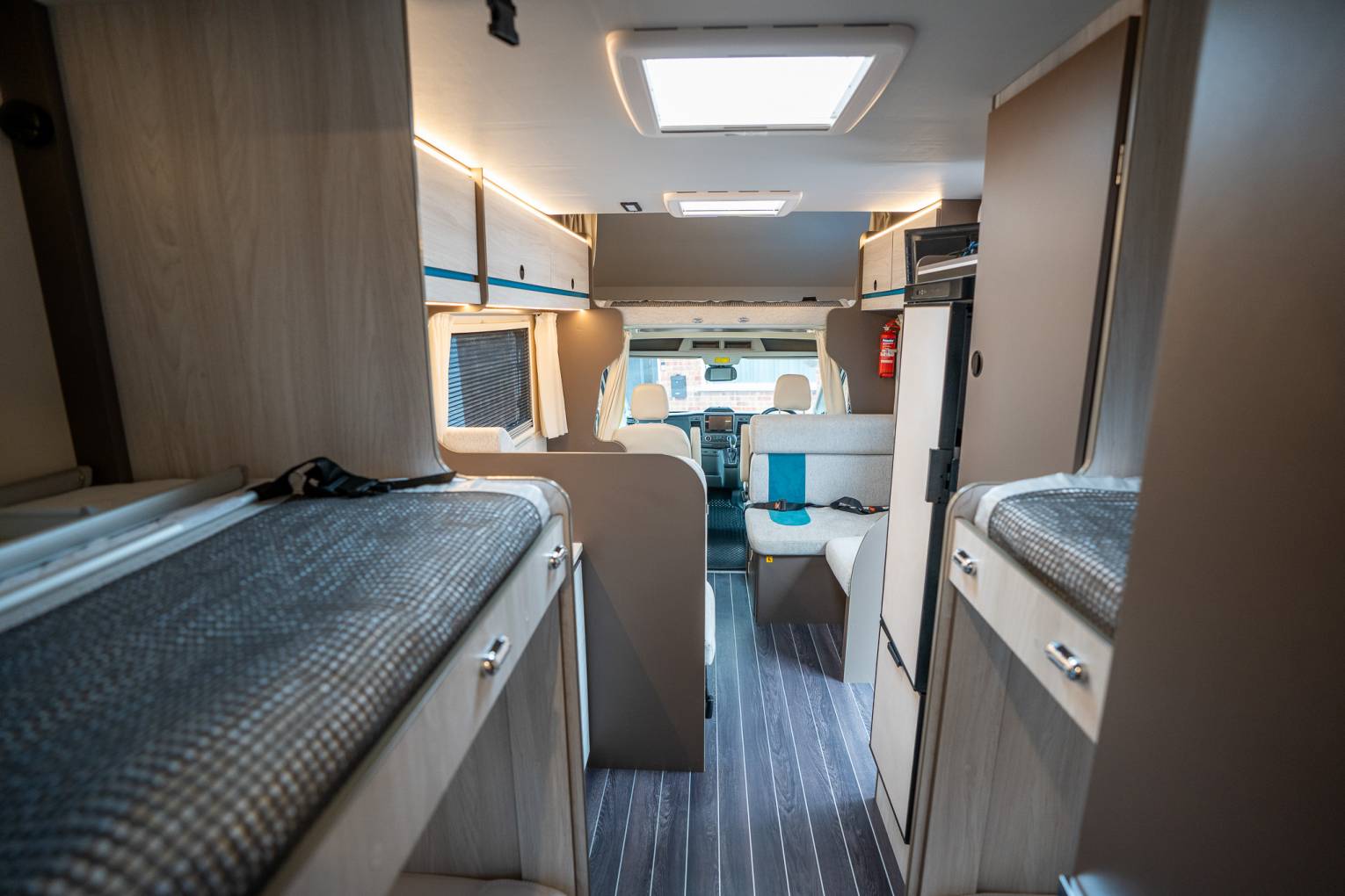 Throughout the motorhome the intelligent use of space is complimented by the LED lighting and premium finish. Upon entering the Habitation Area you are greeted by a spacious lounge area with a TV, shouldered by a double overcab bed and plenty of overhead locker storage. All habitations windows come with blinds and fly screens, whilst additional curtains provide that extra needed privacy throughout. In the rear of the motorhome there are two bunk beds, which come complete with blinds, plug sockets, reading lights and a Safety net to keep those loved ones safe. The rear bathroom comes with a Dometic Toilet, shower and wash basin. The kitchen is fully equipped with a 141L Thetford Fridge with Freezer Compartment, Oven, 3 Gas Burner hobs and enough storage and worktop space to make cooking whilst out on the road a convenient dream. Additional external storage is found by folding away the lower bunk beds and opening up a spacious garage locker on each side, this means you can configure the motorhome according to your needs and interchange between 4 berth and 6 berth to fully utilise the space available.