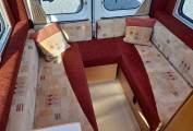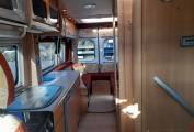 Kitchen – 3 x Burner gas hob with Electric Hot plate, Extractor. Grill & Oven, Sink with Hot and cold running water provide by a Truma Electric and Gas Water Heater, 3-way fridge freezer, Good storage for all your kitchen needs including a foldaway ironing board 240v power plugs and lighting.