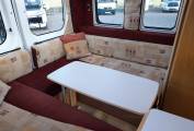 Living – End U shape lounge, Freestanding dining table folds away above cab for storage. Plug sockets, TV, generous storage and window blinds with curtains.