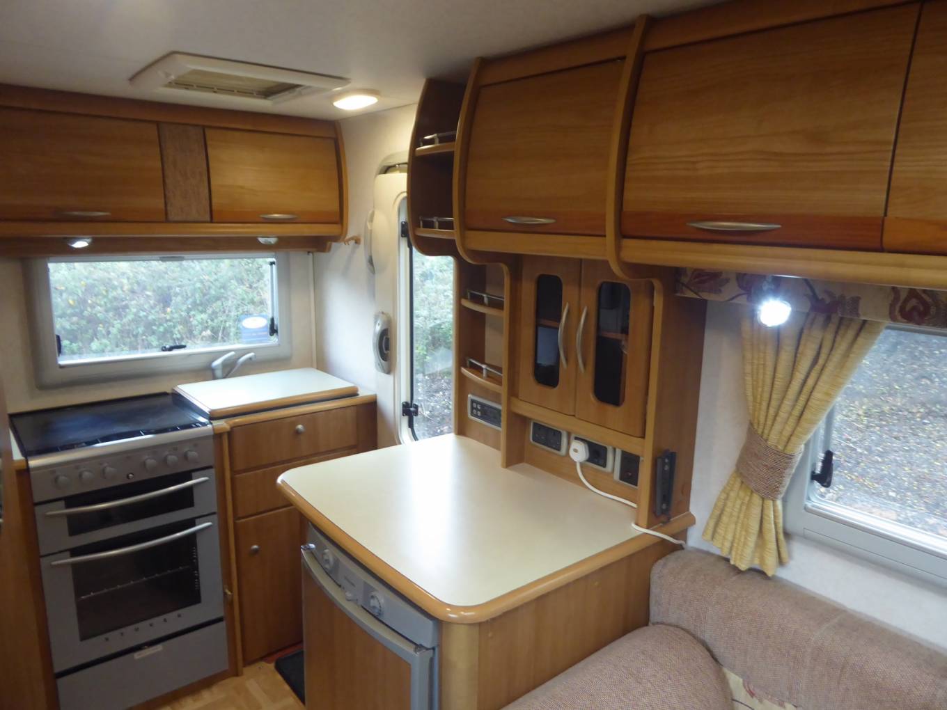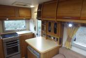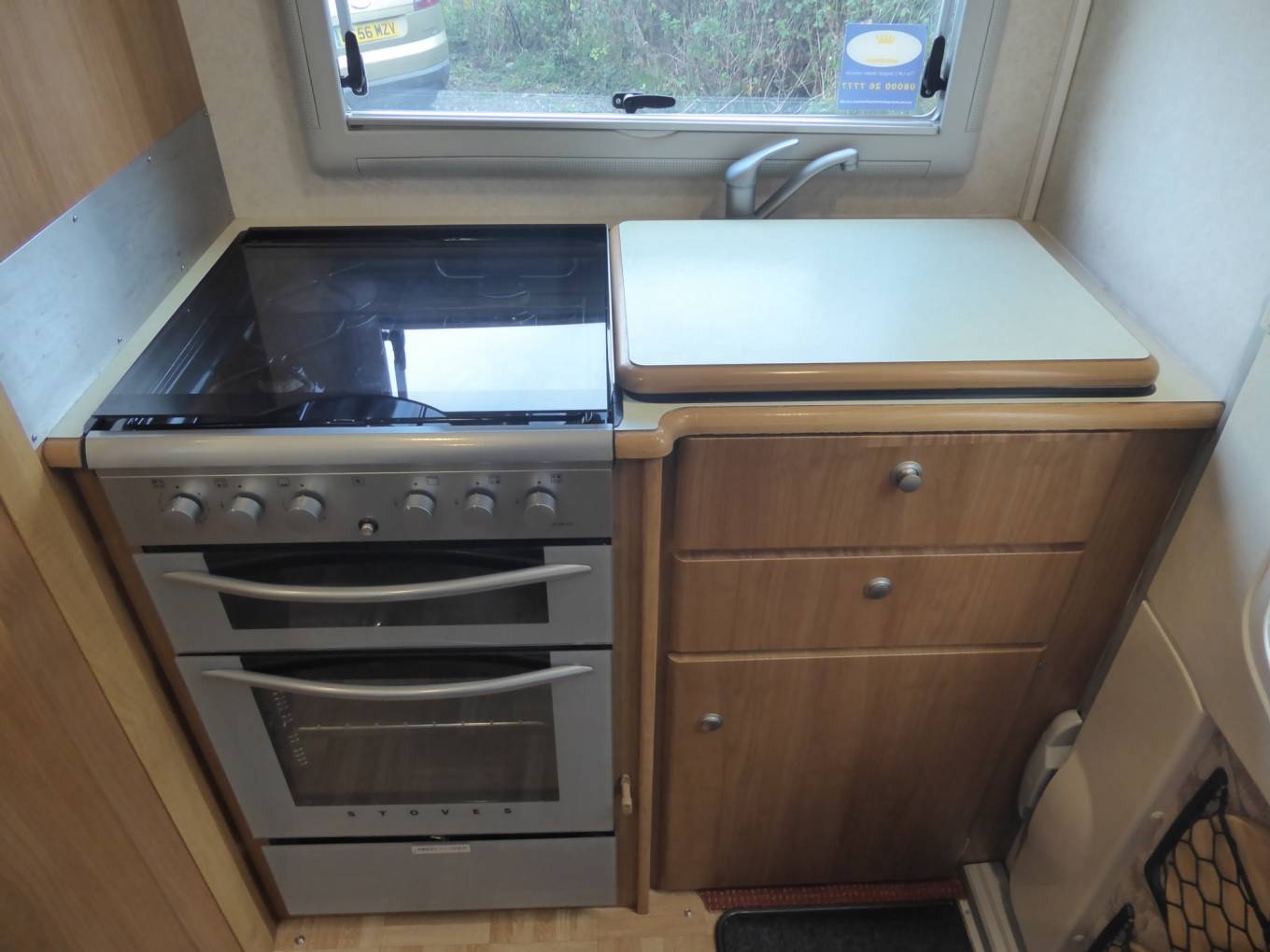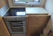 At the nearside rear of the vehicle is the kitchen which has a hob with 3 gas burners and an electric plate, an oven, a grill, and a sink with a drainer.