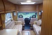 The forward habitation comprises opposing side bench sofas, which can be enhanced as a leisure/dining area with the use of the swivel cab seats, and a choice of a removable, post mounted coffee tables.