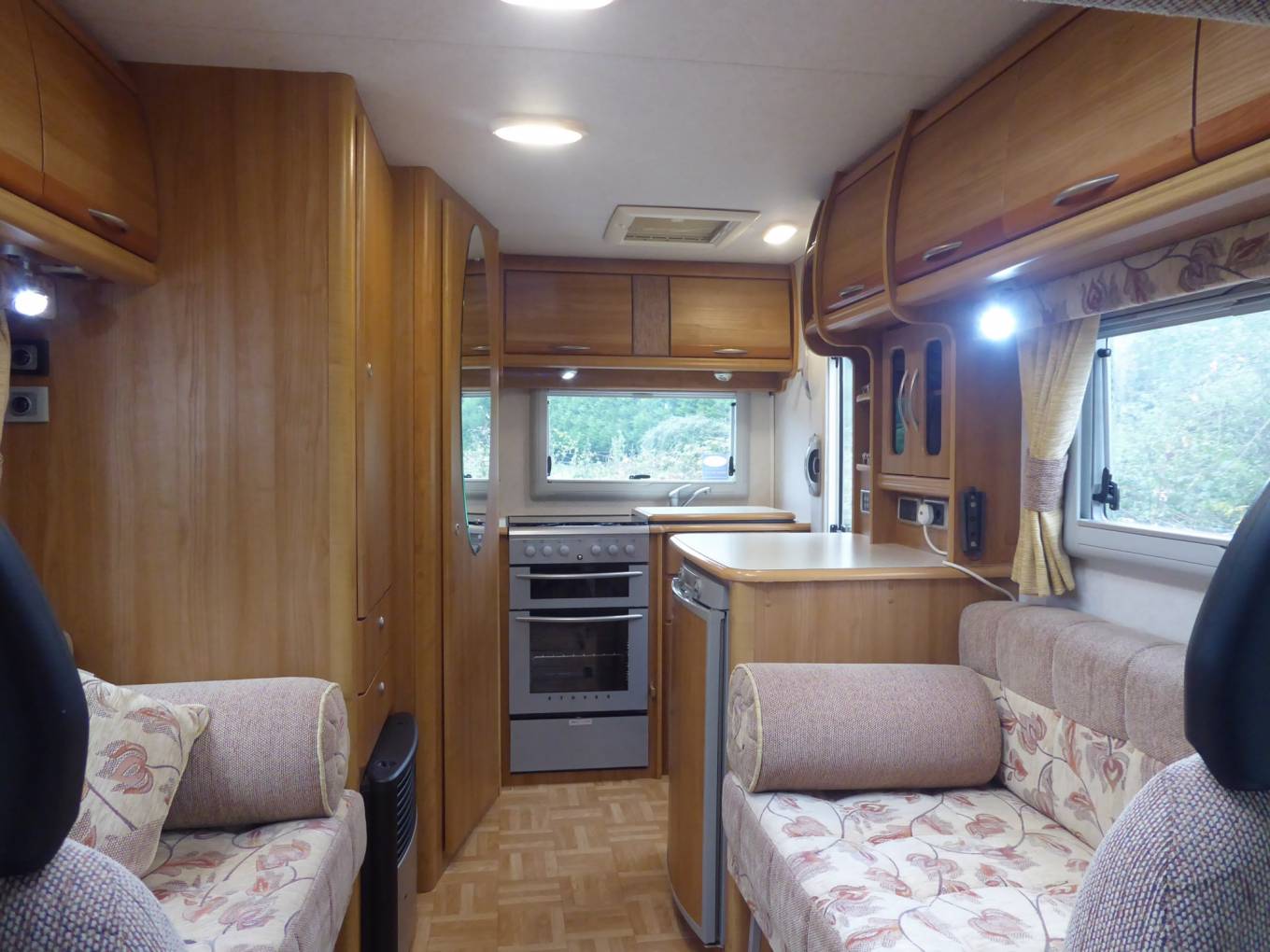 Beyond the leisure dining area there is an offside heater and wardrobe, and, on the nearside, a fridge with a freezer box located beneath a worktop and cabinet.