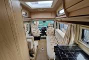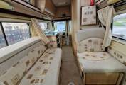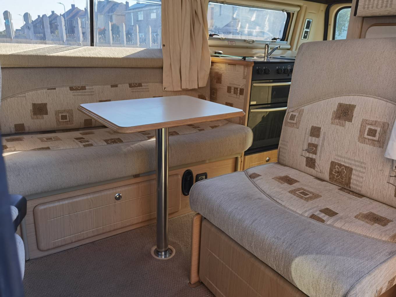 - Open the side door, extend the electric step to enter the lounge & dining area, a side sofa & forward facing single seat with three-point seatbelt fitted, two large side windows, 2 upper side windows & HEKI II wind-up sunroof floods the area with natural daylight. The passenfer seat swivels and there is a large & small dining table, this area makes up into two single beds or a large double bed in the evening, under seat storage & over-cab cabinet to store bedding.