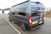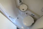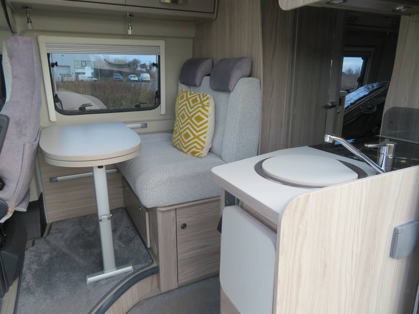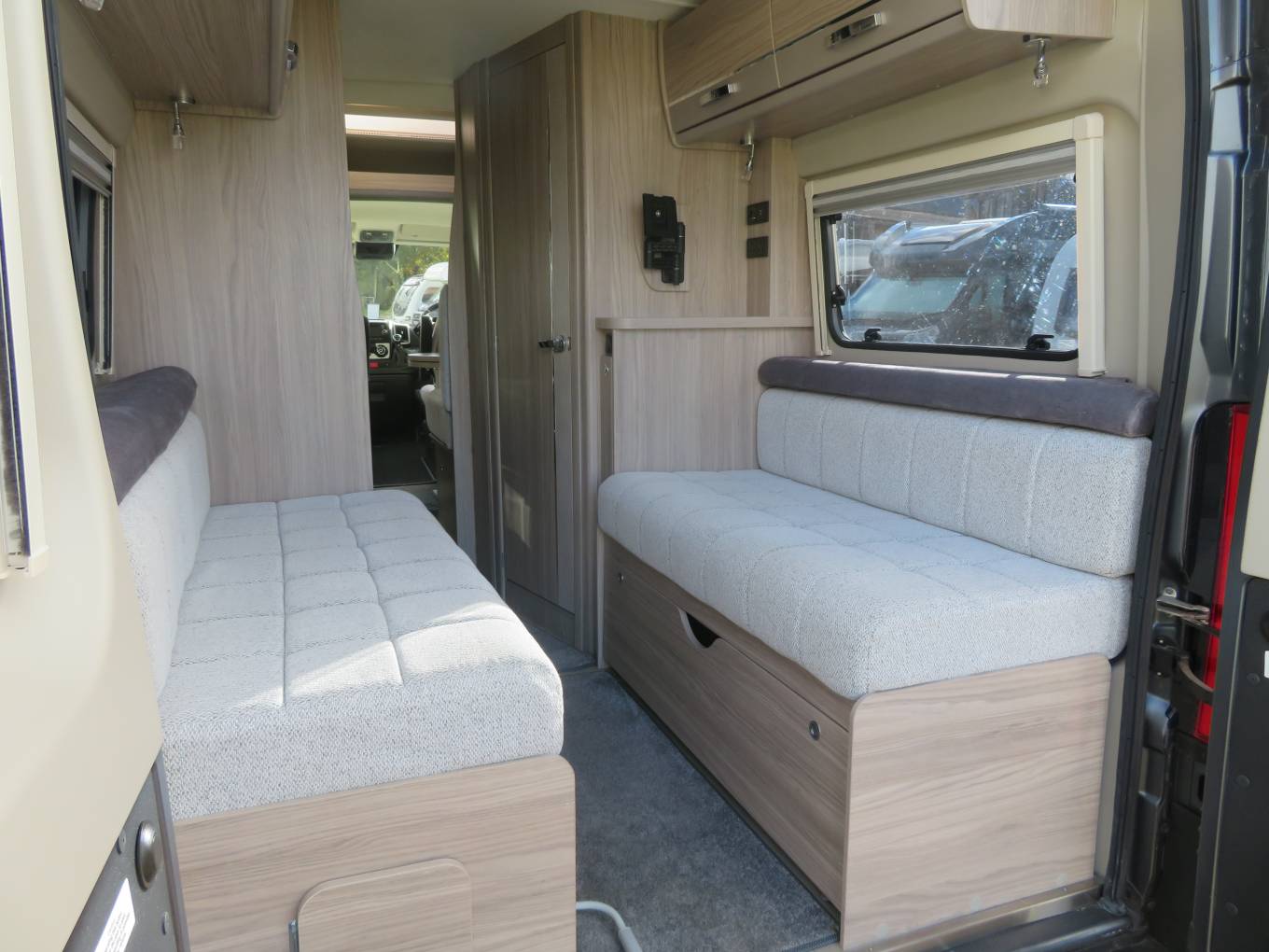 You’ll probably choose to dine up front, but it’s at the back where you’ll chill out. The sofas convert easily into a transverse double bed. A TV bracket, 12V/230V/USB sockets are mounted by the rear wall of the washroom, while drop fronts provide easy access into the under-seat spaces and storage is good because the water tanks, heater and gas are all underneath.