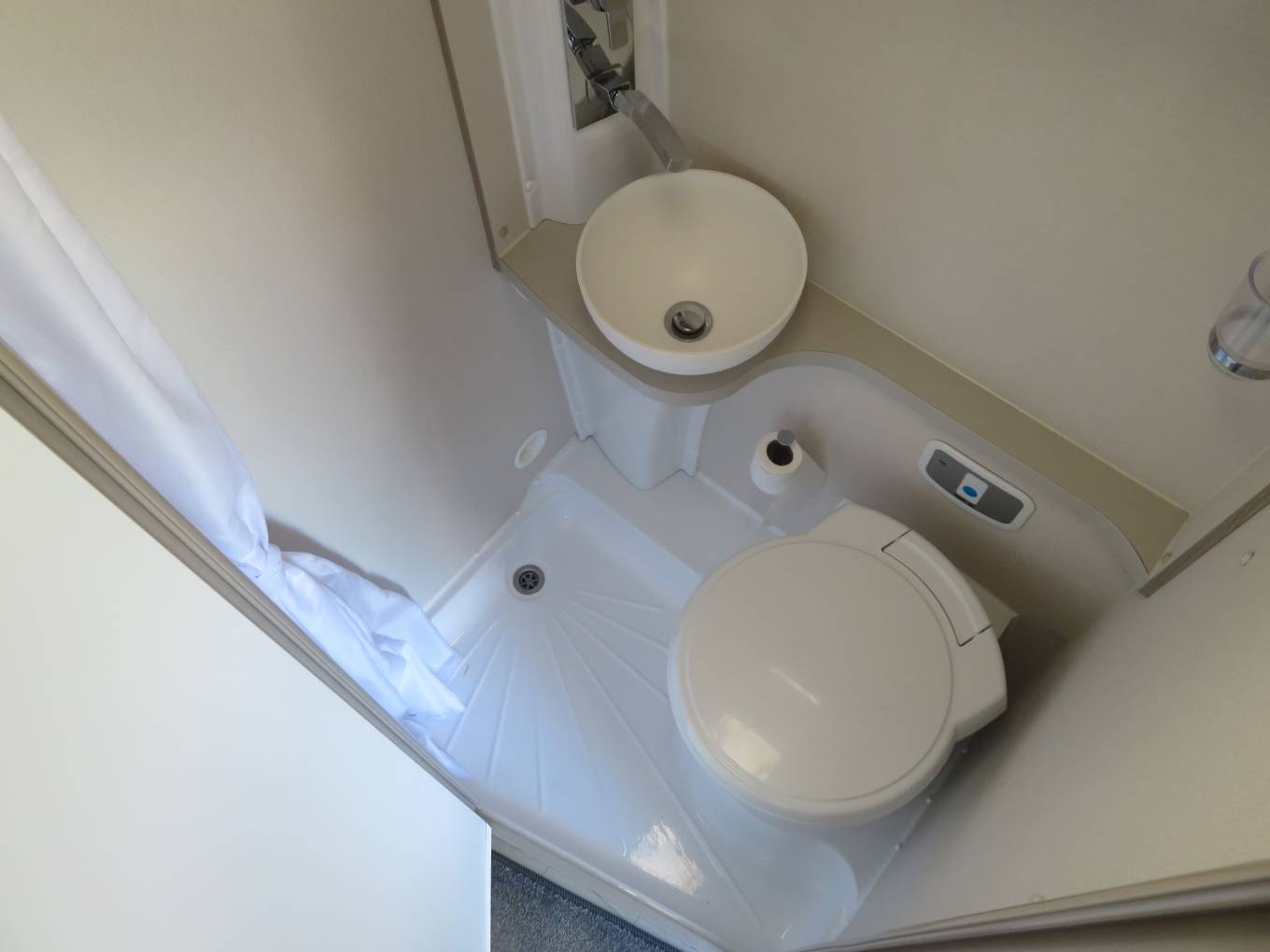 The kitchen is excellent, with a microwave, three-burner hob above a combined oven and grill and a tall fridge. There’s a worktop flap at the forward end of the galley, where you’ll also find a bank of small drawers.