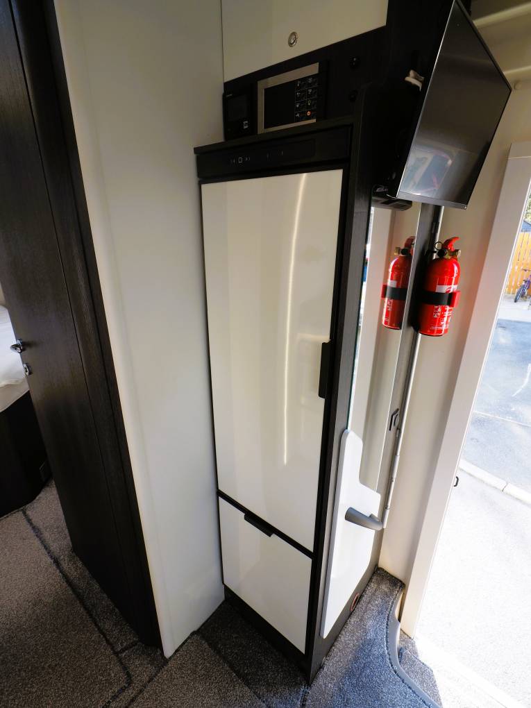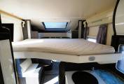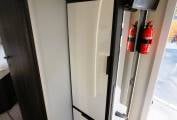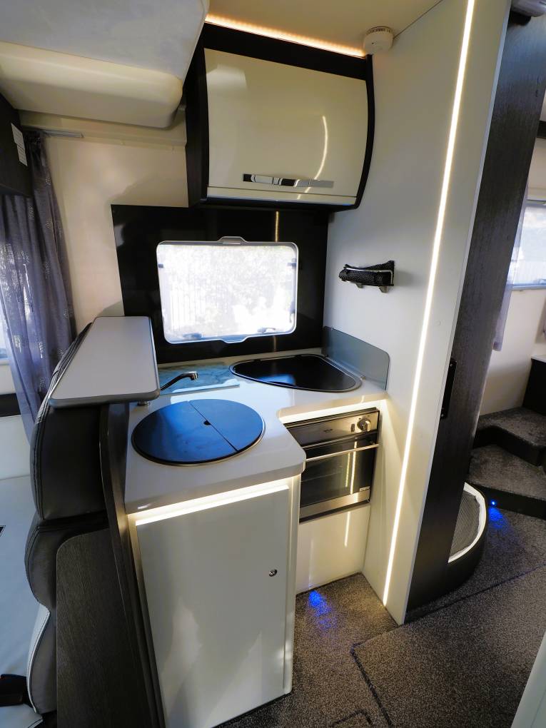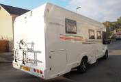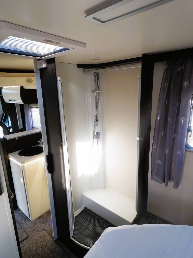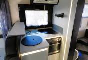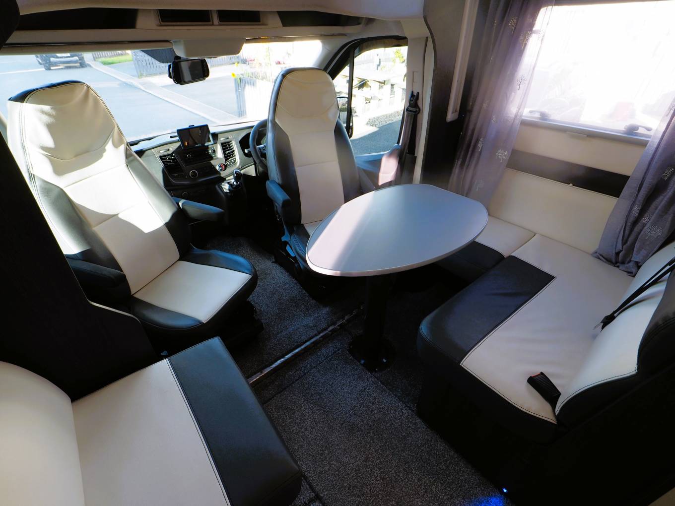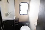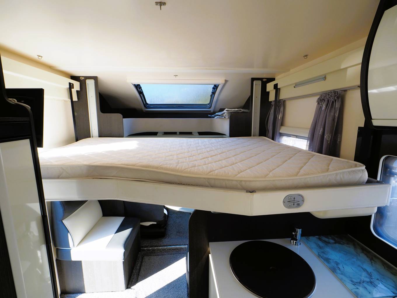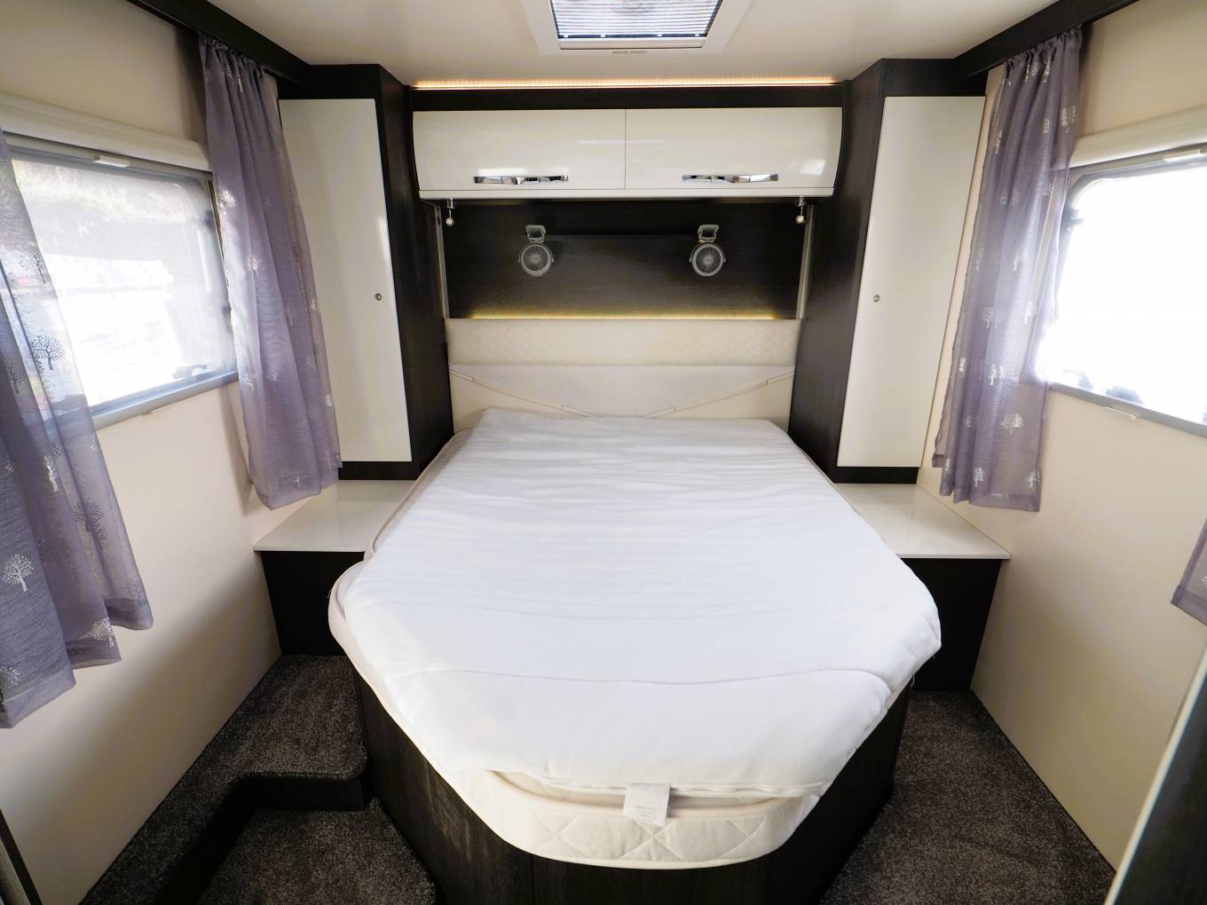 Externally there is a wind-out sun canopy, bike rack and access points for electric hook-up, water and gas locker. The gas system is a re-fillable Gas-It system which is perfect for those venturing into Europe for a hassle free refill if required. A 230v 3 pin socket is provided to supply a power point outside or into an awning. Heating and hot water comes from the reliable Truma system with control panel and a 12v leisure battery with solar panel and split charger supports the 230v hook-up.