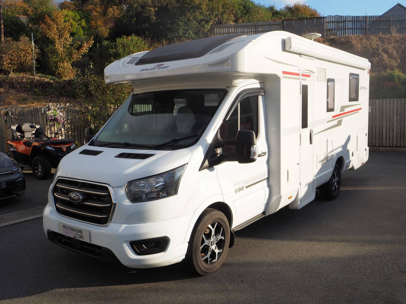 Motorhome Depot Wrexham & Gwynedd are pleased to be able to offer this low mileage Roller Team Zefiro 696. This is a 4 berth and 4 belt motorhome providing luxurious accomodation for an adventurous couple or family. Rear private bedroom space with large island bed, wardrobes to both sides and overhead locker storage, central washroom includes a flushing cassette toilet, sink with vanity mirror and storage and separate shower cubicle. A drop down electronic bed provides a convenient second berth and can accomodate 2 adults. The kitchen area is well appointed with 3 burner gas hob, combi oven/grill, sink with mixer tap, large 3-way fridge with pull out chilled drinks drawer and separate freezer. Up front is a comfortable dinette area with table and with the front passenger and driver seats swivelled can accomodate up to 6 people. A TV on swivel mount is included.