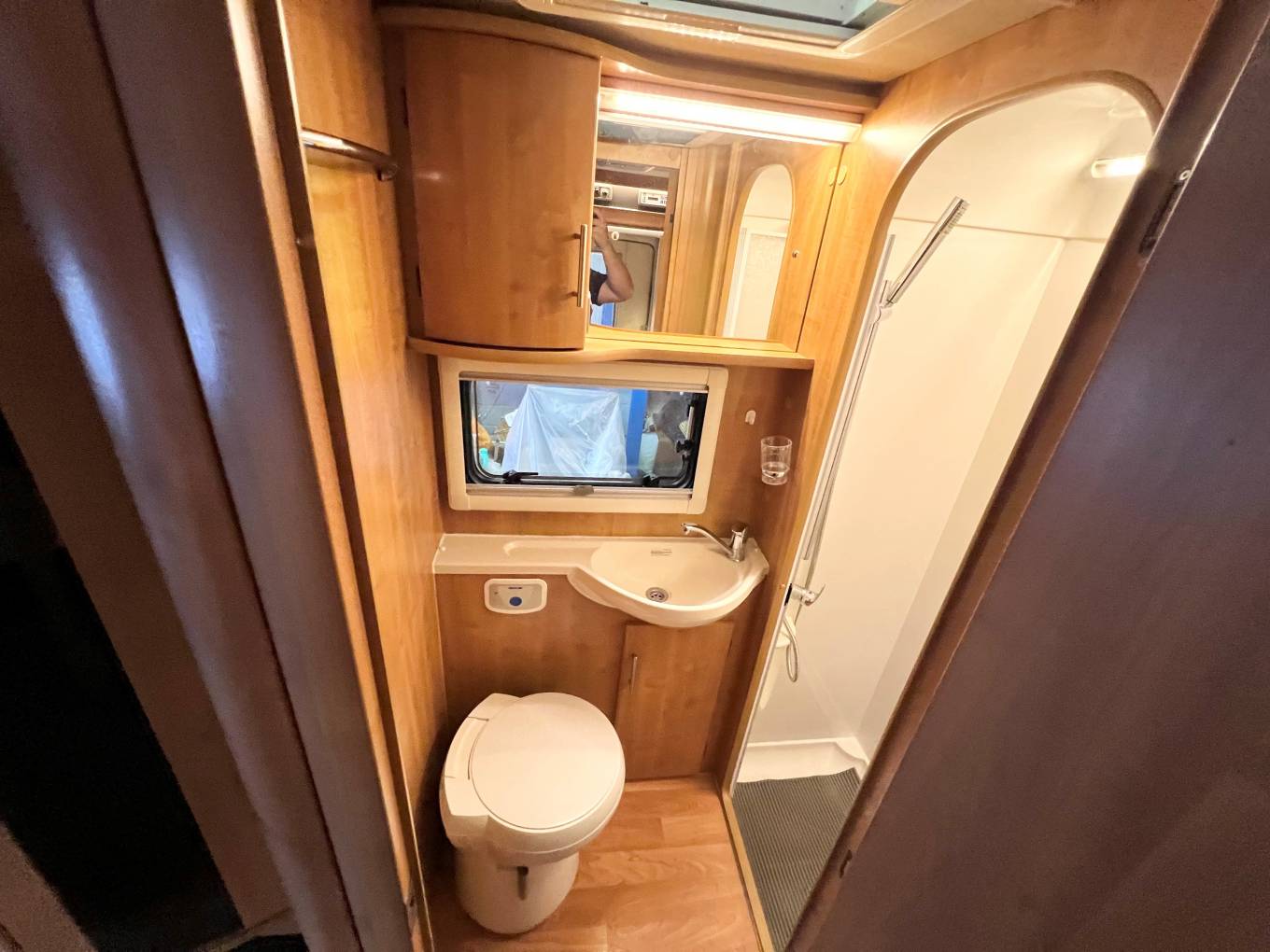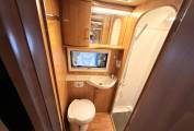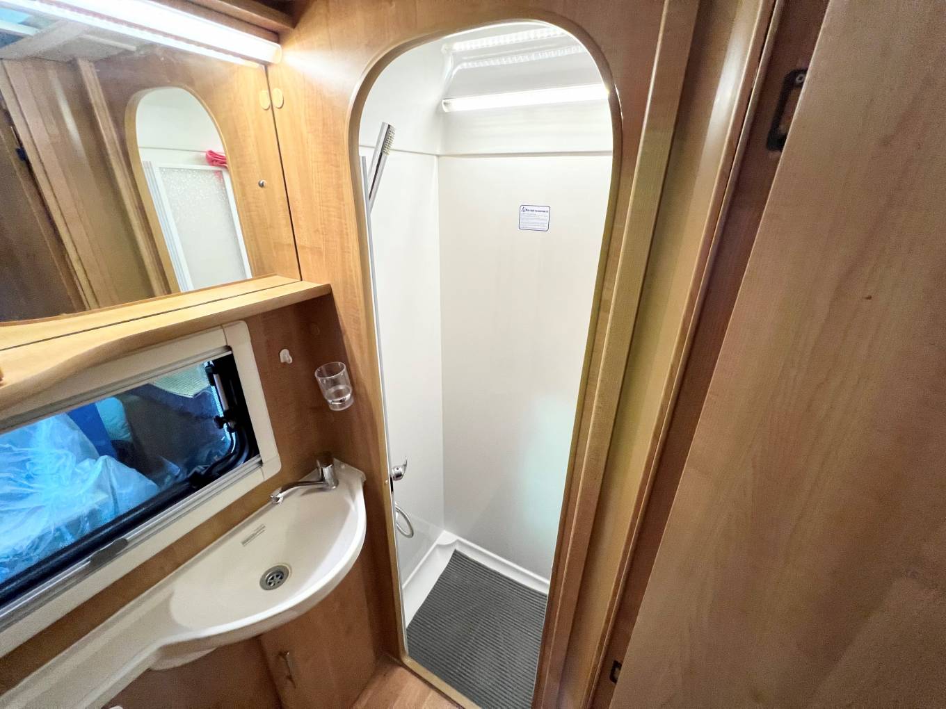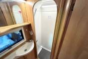 The rear washroom is a good size and offers a separate shower cubicle with shower screen, a Thetford cassette toilet with electric flush, a washbasin with chrome mixer tap and there are storage cupboards and a mirror.